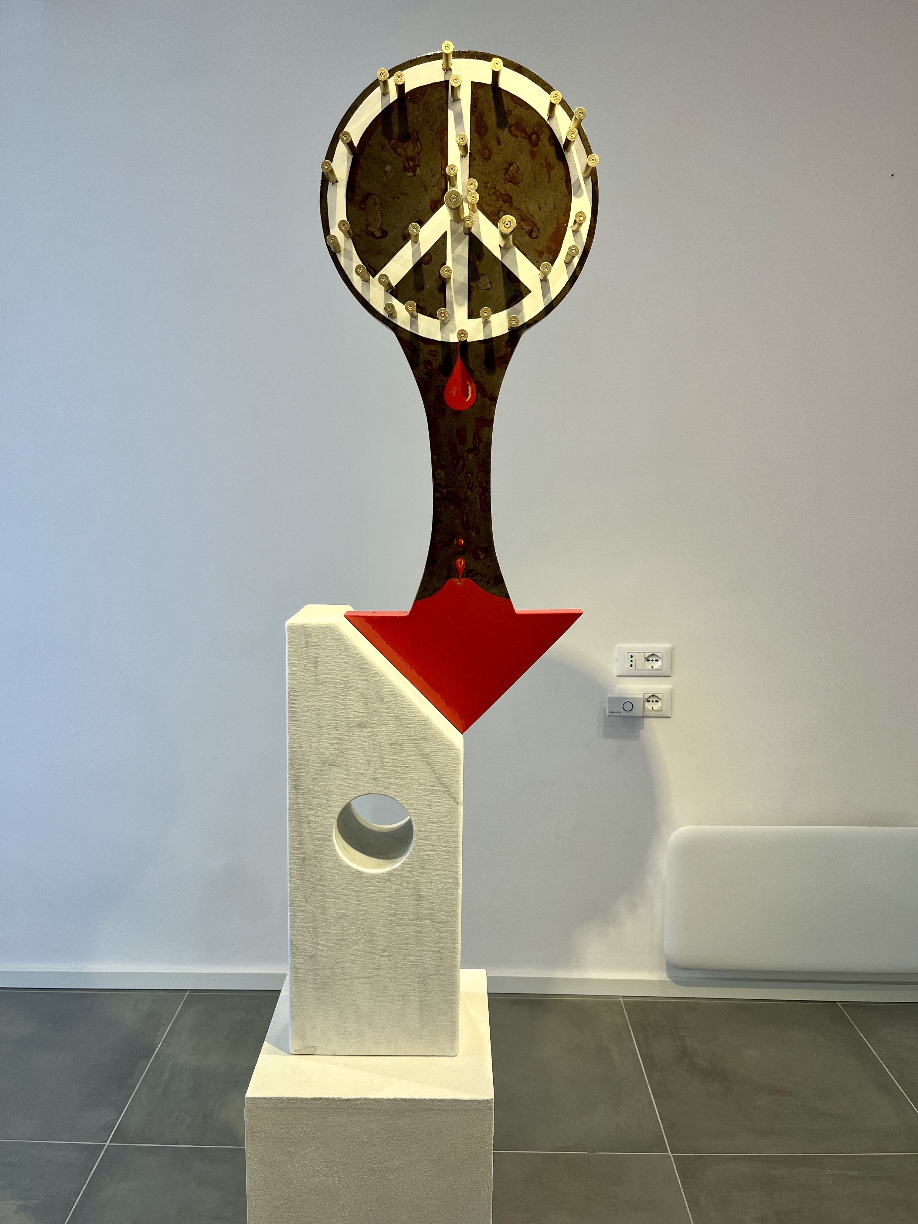 La base in marmo con un grande foro passante rappresenta la ferita profonda ed incurabile che lascia ogni guerra nel popolo che l’ha vissuta.