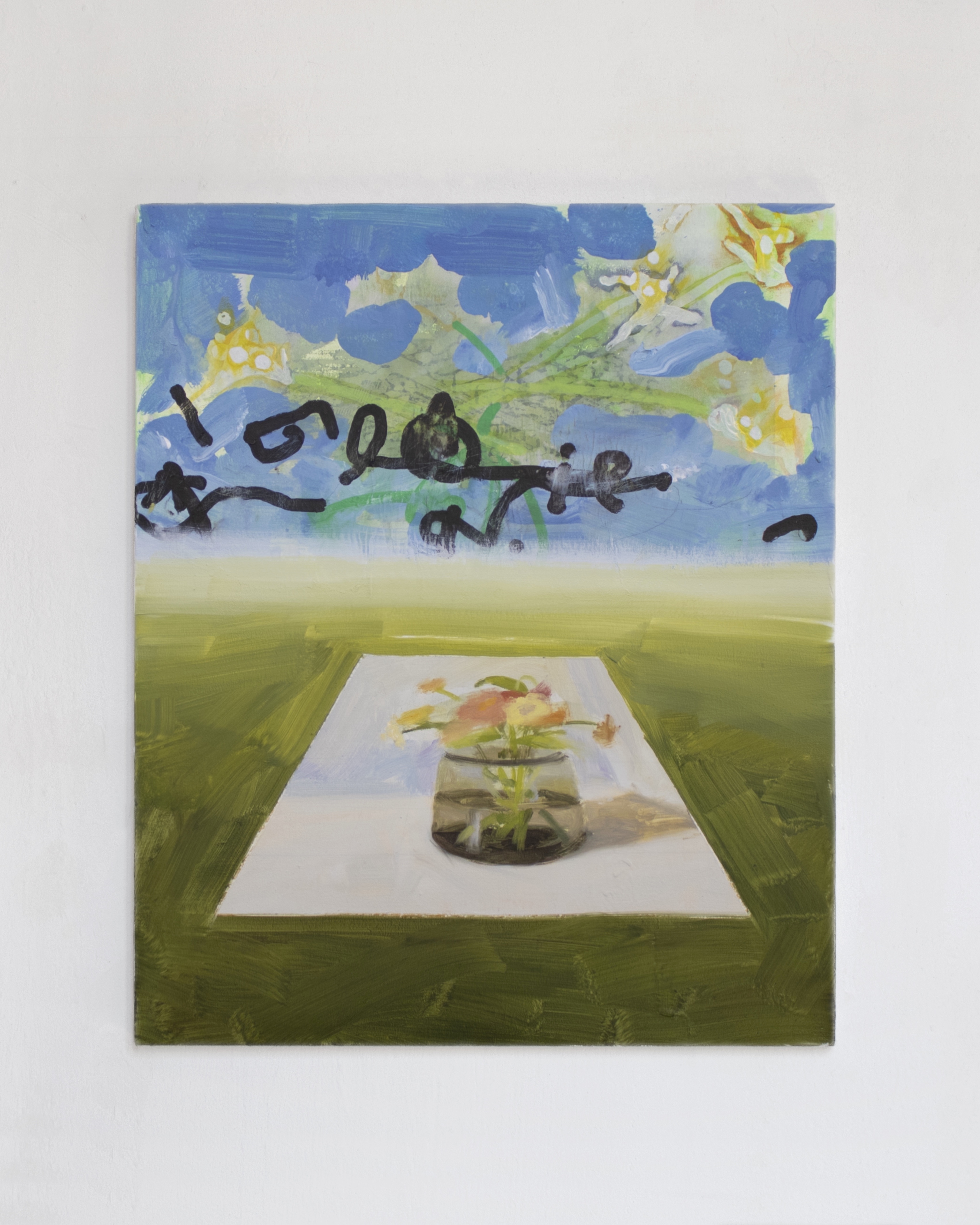 L’opera si articola in due sezioni distinte, creando un dialogo stratificato tra linguaggi pittorici e codici della riproducibilità. La parte inferiore presenta l’immagine di una natura morta prospetticamente distorta collocata in uno spiazzo erboso.