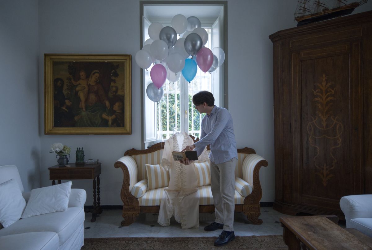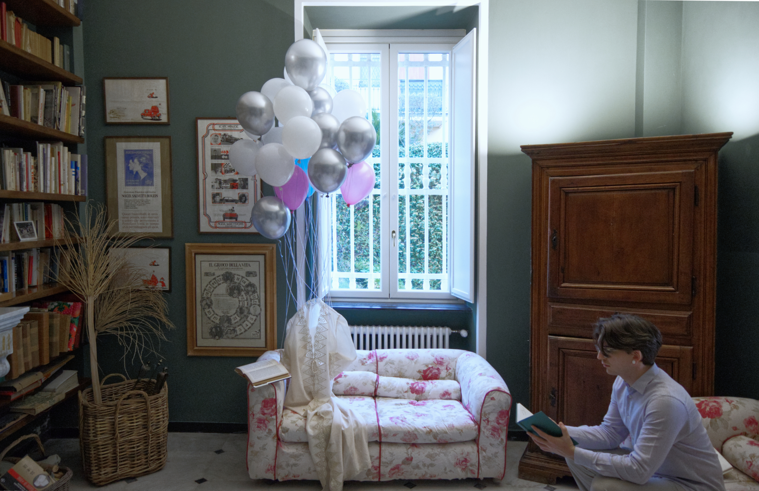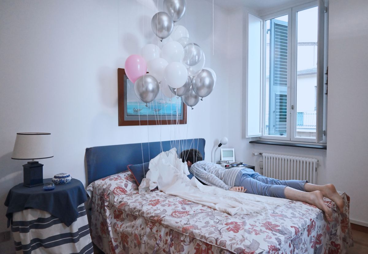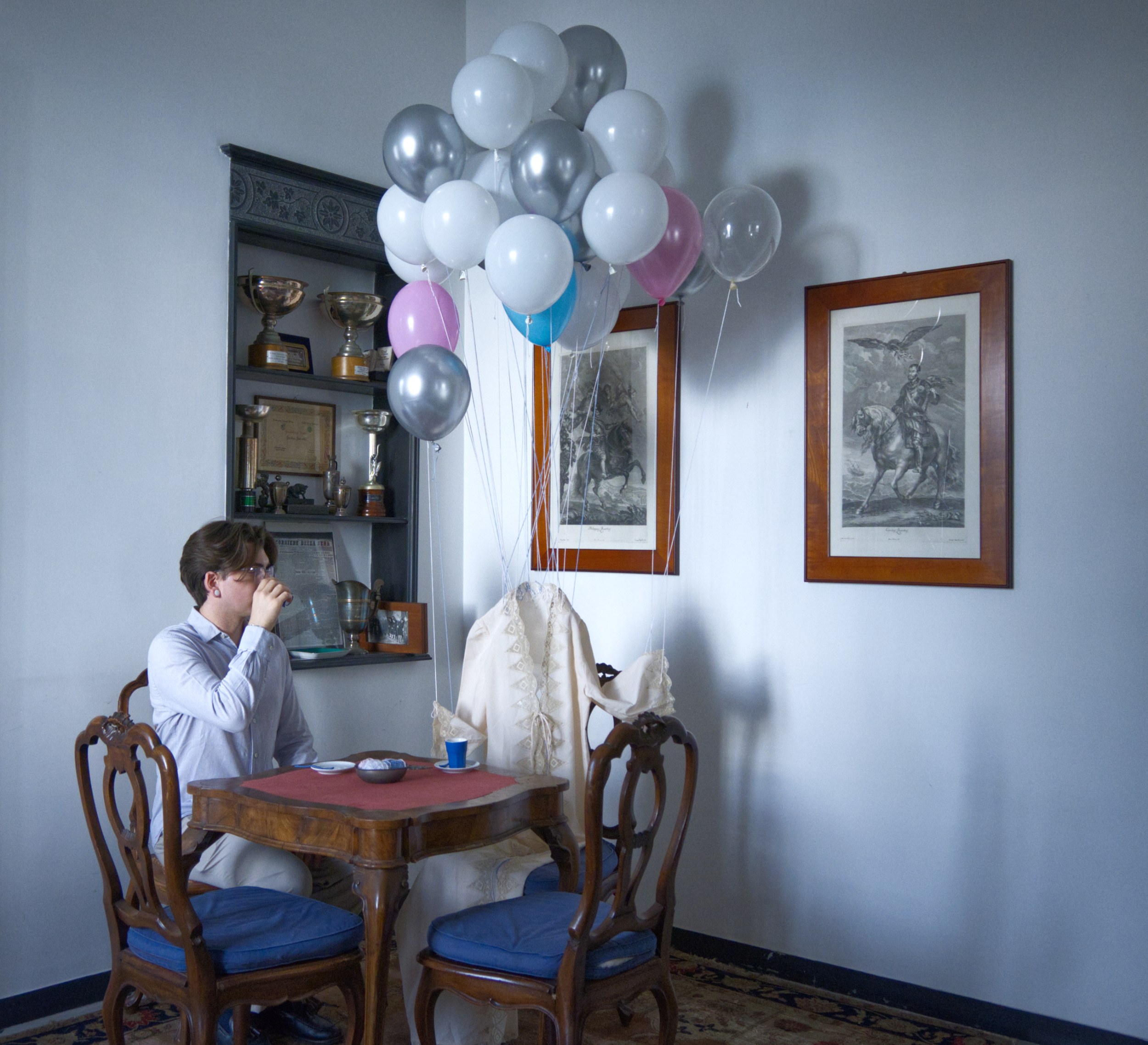 In quest’ottica si colloca ”Epifania di leggerezza (chiacchiere tra sconosciuti)”, dove un vestito sospeso da palloncini attraversa lo spazio domestico come un “corpo possibile”, un’eco di leggerezza. Lo scatto fa parte di una serie più ampia, dove tale figura fluttuante coesiste con la mia, ritratta in gesti minimi e quotidiani, come bere un caffè, leggere, riposare... Due presenze che condividono lo stesso ambiente, ma che non si incontrano mai davvero: tra loro si apre un dialogo muto, fatto di attese, di proiezioni, di desideri che restano a distanza. Il titolo stesso allude a questo distacco: un incontro solo immaginato, un pensiero che si affaccia e subito si ritrae. Qui la leggerezza è un anelito, come ogni tentativo di elevarsi al di sopra della propria condizione. È un gesto che non nega il limite, ma lo sfiora. E che, proprio in questo sfiorare, ci invita – anche solo per un istante – a sollevarci da terra.