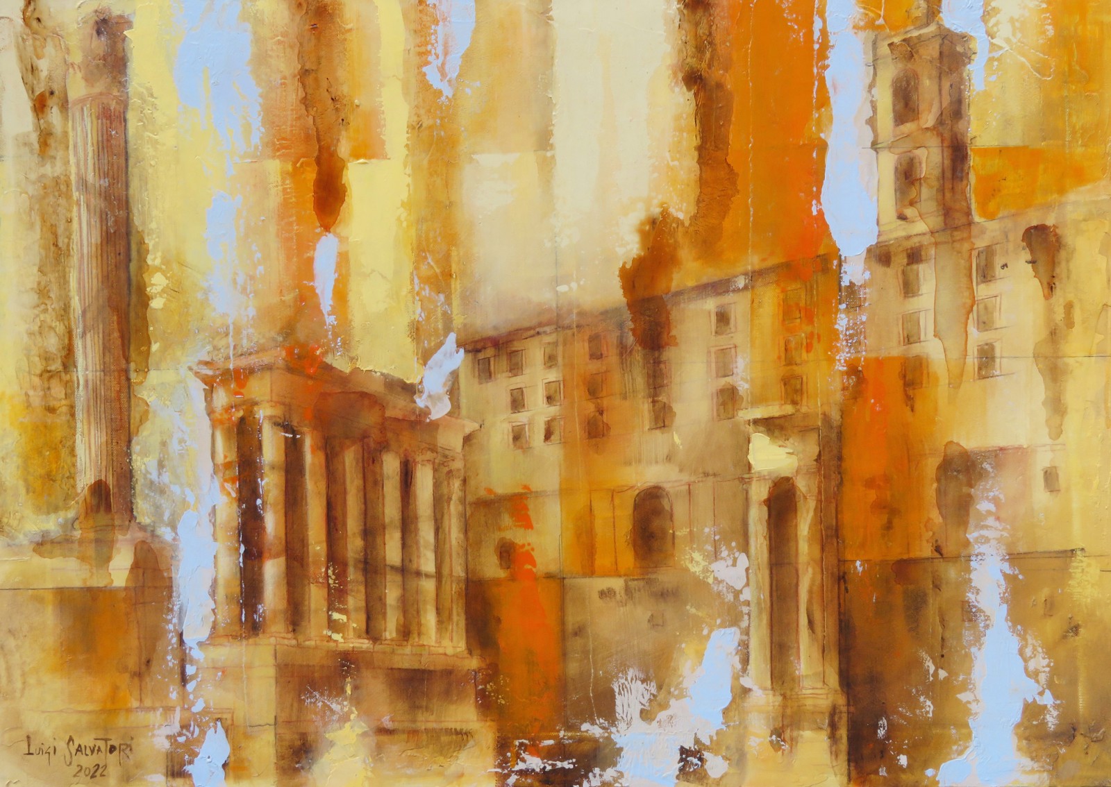 Luigi Salvatori dipinge una ricerca interiore dove i paesaggi reali sono sostituiti da paesaggi filtrati attraverso la memoria, il desiderio dell’invisibile, dell’infinito.