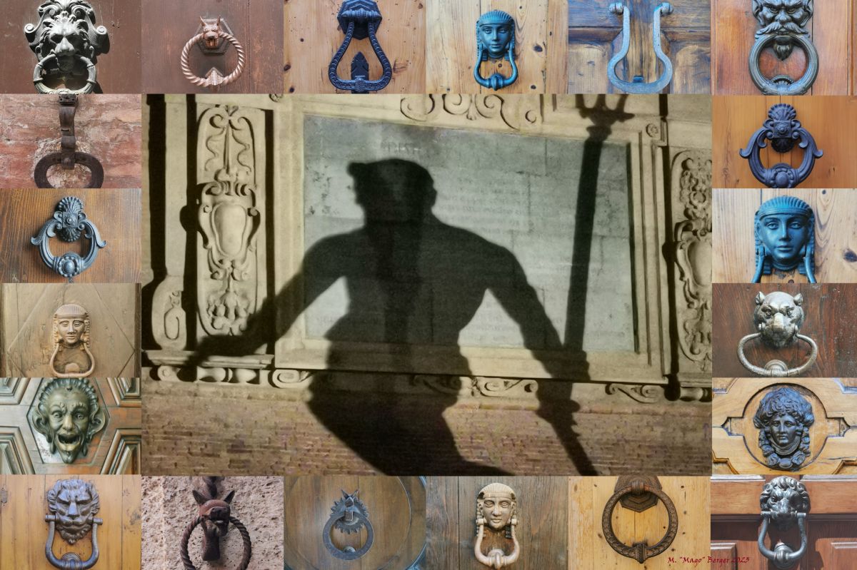 A special moment at sundown in Bologna captured by the shadow of Neptune it created on a wall framed by a variety of of door knockers from the area.