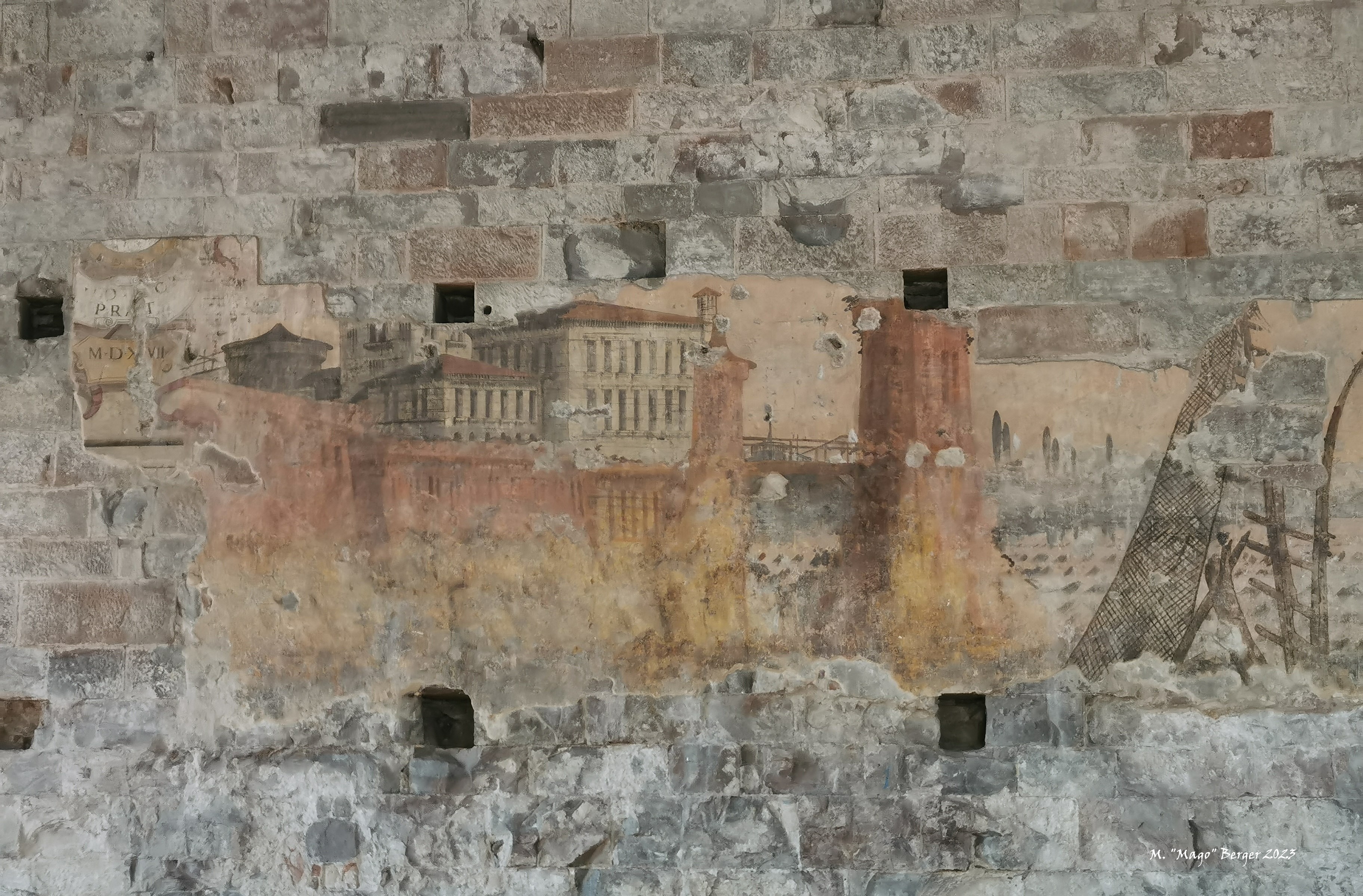Found this Fresco in an old palace in the center of Bergamo and was fascinated not only by the fresco itself but also by it’s setting on this wall where layers of plaster had come of, exposing the brickworks behind it.