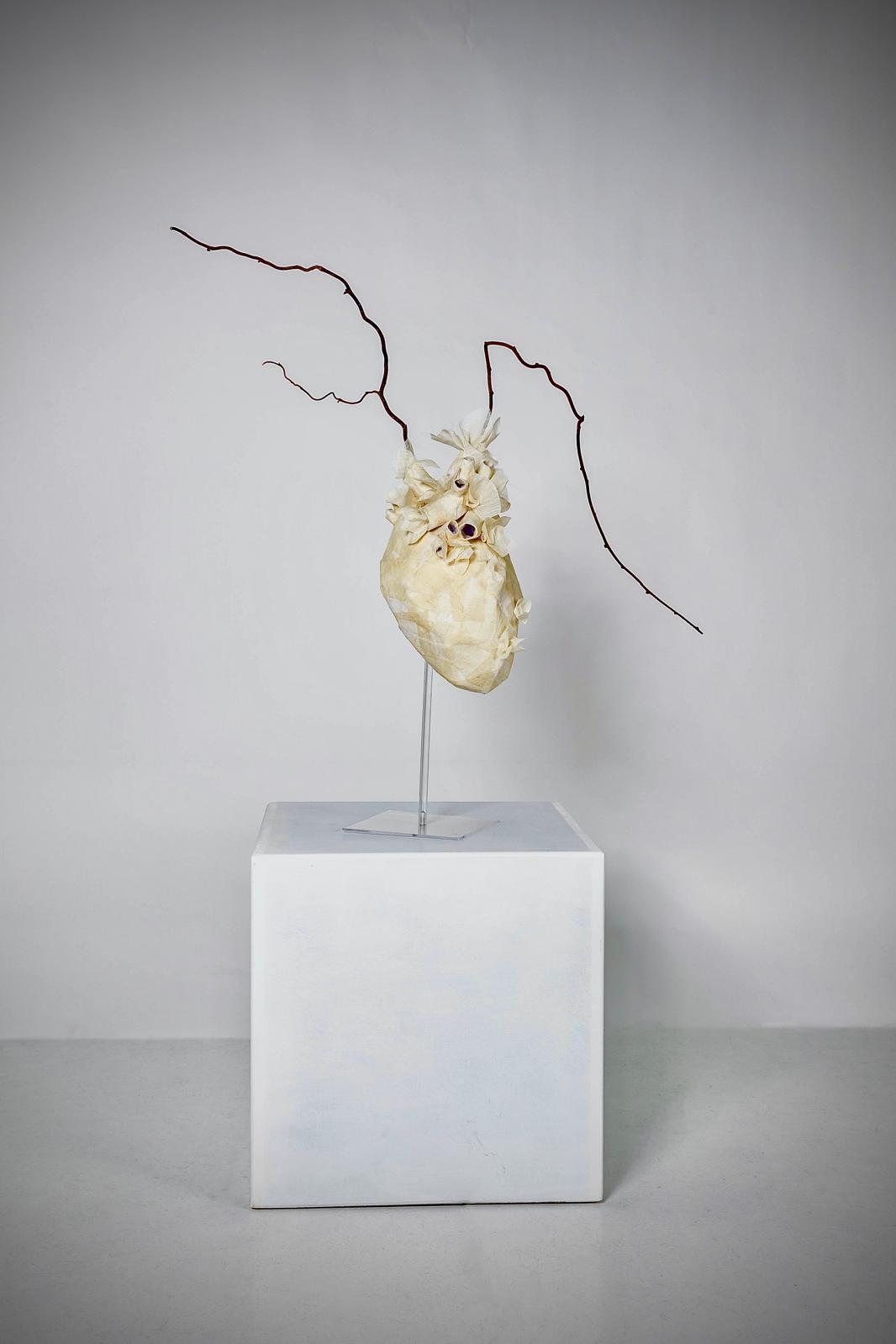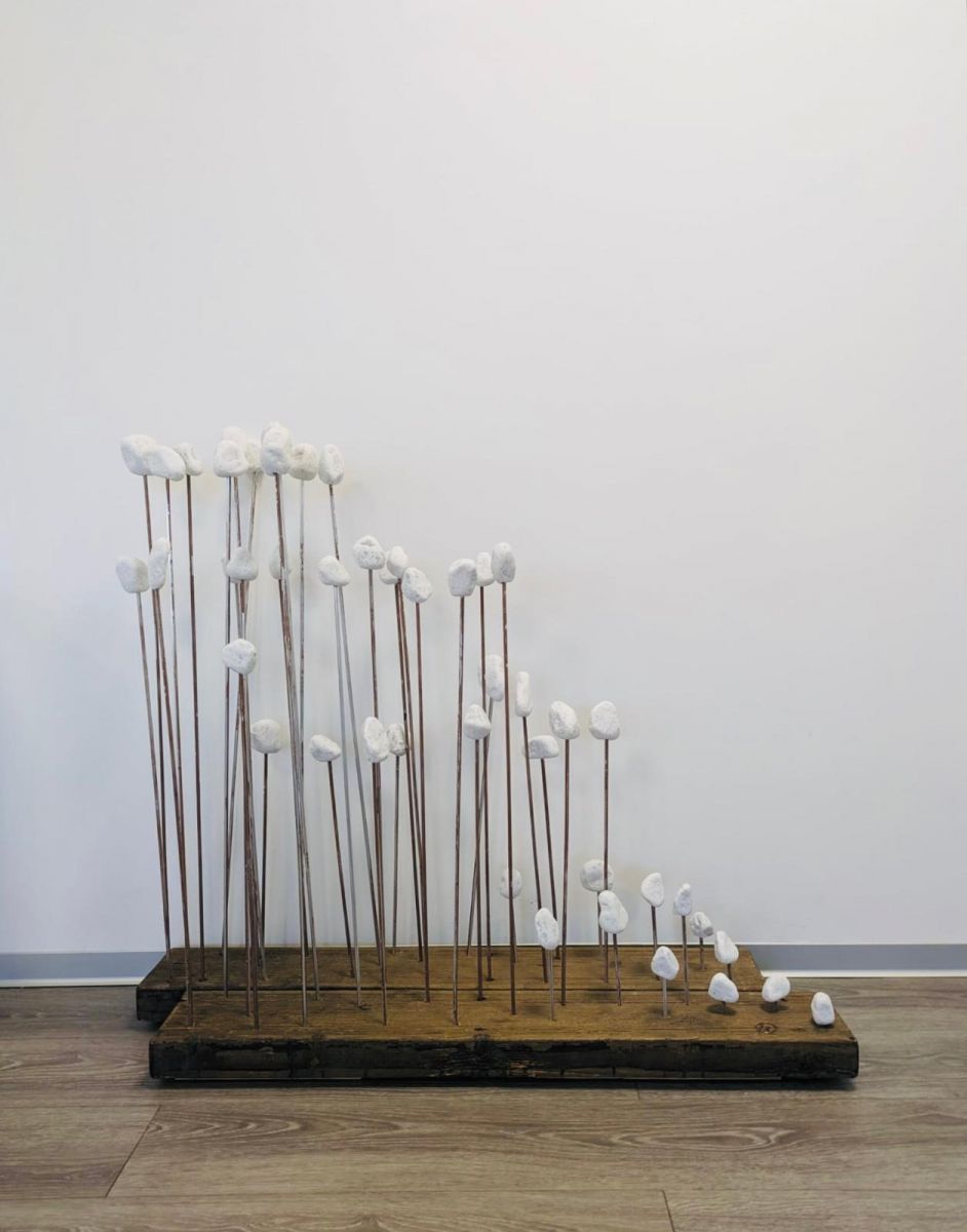 Pietre bianche incastonate su sottili bacchette metalliche come gigli di mare unici nella resilienza nei confronti della aridità e della acredine della sabbia sferzata dal vento e avvolta dalla salsedine. / Marina Comerio nasce a Milano nel ’77, studia disegno e pittura frequentando lo studio del pittore Santo Nania per sette anni, elabora così la sua personale maturità espressiva; passa attraverso alcuni vissuti fisiologici di crescita artistica, dalla pura descrizione della realtà, alla ricerca di sentimenti e stati d’animo interiori ed infine rappresenta la bellezza utilizzando la forma e l’uso del colore, dedicandosi in maniera sempre più profonda all’arte concettuale. Attraverso la creazione/realizzazione di installazioni si esprime a trecentosessanta gradi coinvolgendo il fruitore direttamente anche attraverso la Video Art. La Fotografia segue di pari passo le mutazioni del suo percorso nel mondo dell’arte e la sua sensibilità verso la realtà.