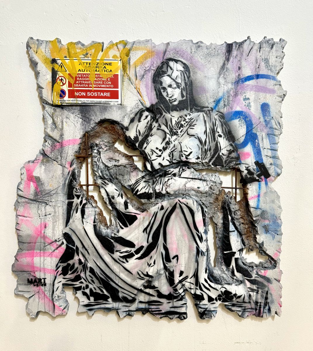 Descrizione dell’Opera . Da un muro con fori, spaccature, viene fuori una sagoma dove ognuno può immaginarsi qualsiasi interpretazione..l’artista in questo preciso momento intravede la sagoma di Gesù Cristo della pietà di Michelangelo e subito rappresenta sul muro la Madonna con un martello in mano. L’intento dell’artista è rappresentare la scultura di Michelangelo su un supporto bidimensionale come se fosse stato realizzato sul muro di una città, eroso dal tempo, alla vista di tutti. Così facendo l’arte di strada, la street art, ha la possibilità di entrare nelle case di qualsiasi persona che acquista l’opera, decifrando e rappresentando il cambiamento dell’arte attraverso i secoli, dando in questo modo una visione Nuova che potrebbe essere una corrente artistica ancora da coniare.