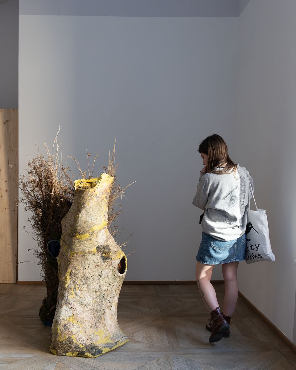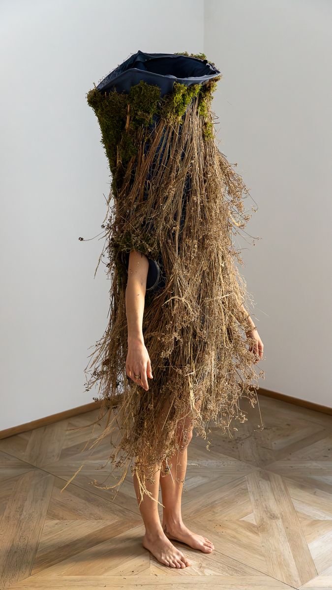 Le due sculture si presentano come assemblaggi liminali: strutture di metallo, carta e stoffa ricoperte da muschio, sterpi e alghe di stagno (raccolte e convertite in un biomateriale simile alla carta). Non più oggetti né organismi, ma dispositivi ibridi che attivano una relazione corpo-ambiente: quando indossate, trasformano il movimento in azione site-specific, il loro incedere mappa territori dove rifiuti industriali, rigenerazione vegetale e fisicità collidono. Avviene così un tentativo di superamento della divisione tra artificiale e organico; il corpo diventa interfaccia, trasformandosi in un ”Quarto paesaggio”.
