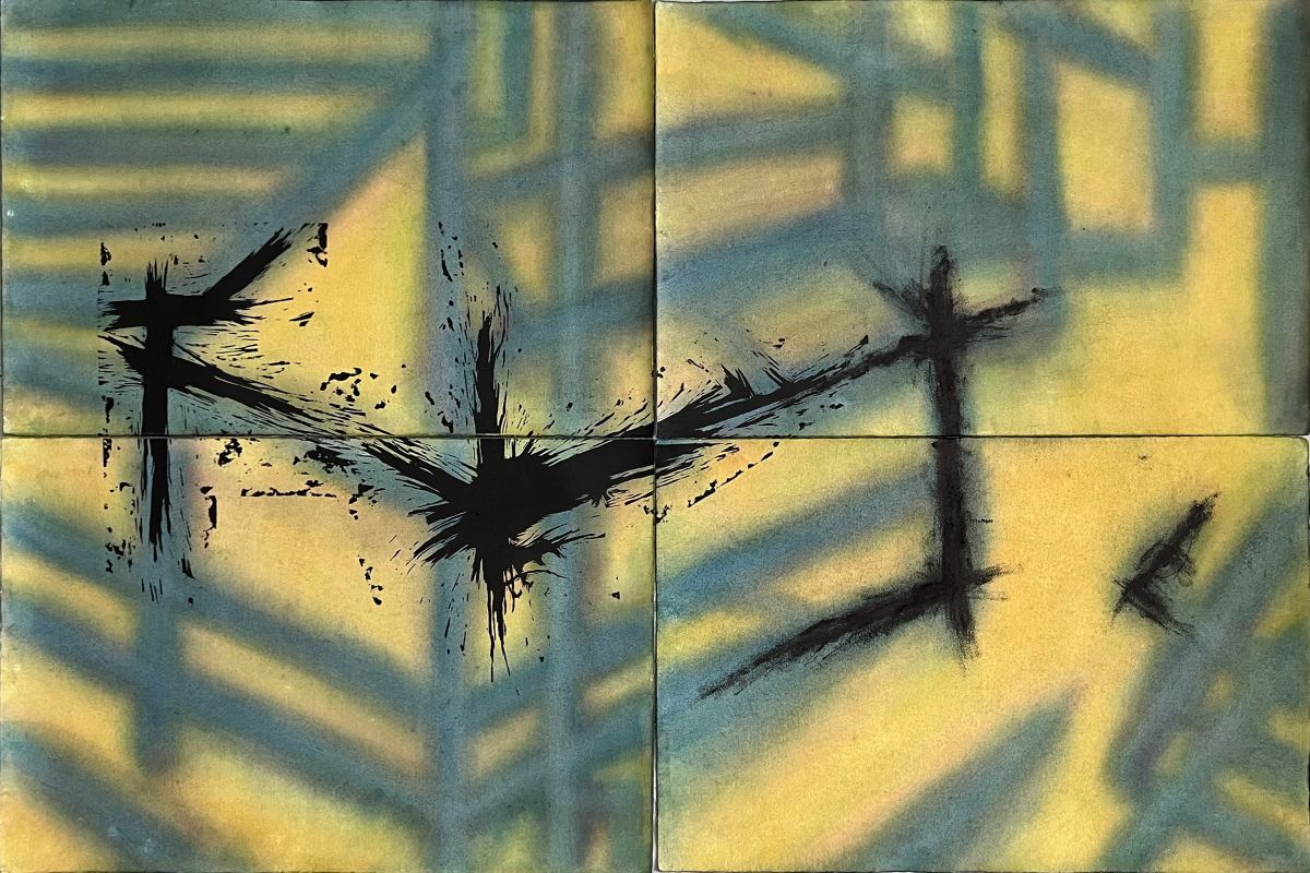 pastello a olio, grafite e acquerello su carta da stampa, carta