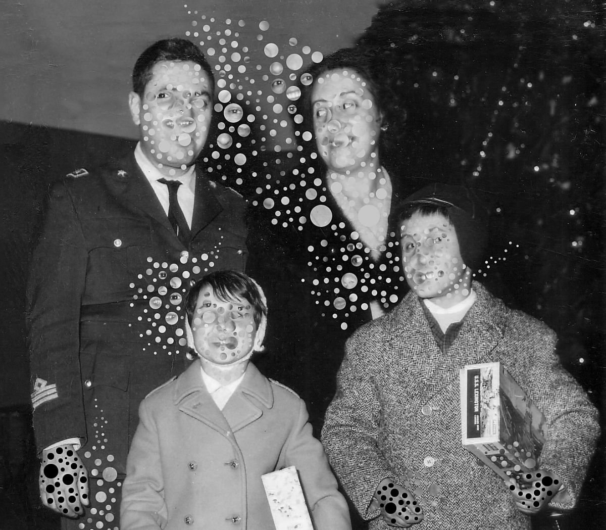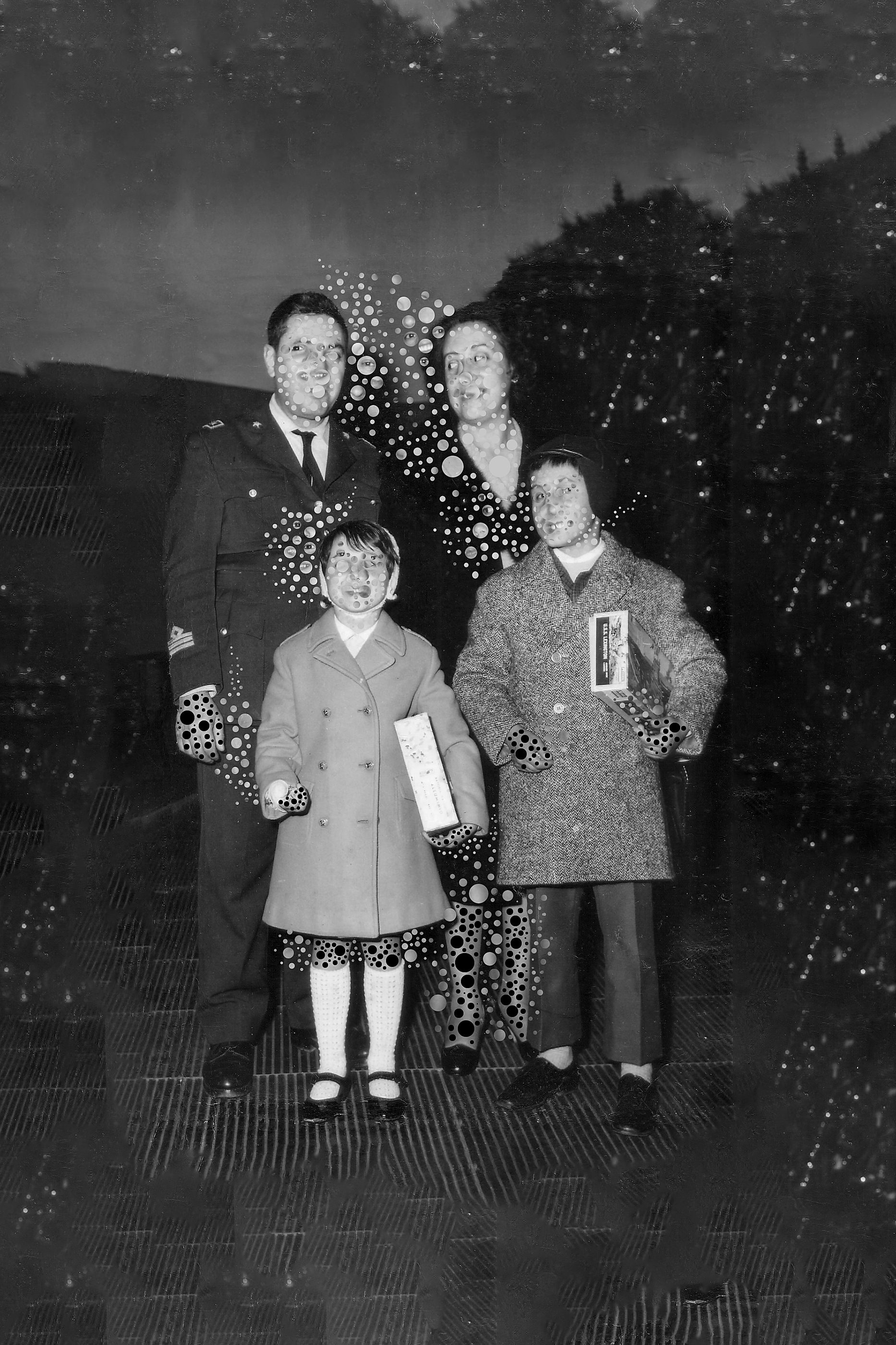Utilizzando fotografie dal mio archivio di famiglia e scannerizzandole, sono poi intervenuto manipolando digitalmente i file, cancellandone alcune parti, prelevando porzioni di immagine e ricombinandole tra di loro. Idealmente riproducendo la disgregazione della materia e degli atomi che continuamente si rimescolano dando origine a nuove forme, proprio grazie al processo entropico al quale ogni cosa è soggetta, compresi i nostri ricordi. Le immagini diventano quindi simbolo di, e contributo a, questo processo irreversibile, che livella l’esistenza di tutto l’universo conosciuto verso un destino condiviso.