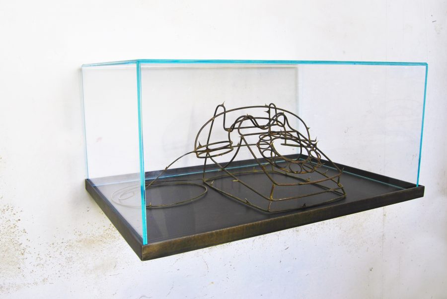 Si erge un telefono antico. Il suo contorno, modellato in filamenti di ottone, appare fragile ma maestoso, un intreccio di metallo che racconta storie di tempi lontani. I fili di ottone si snodano, come radici che affondano in un terreno segreto, e da essi, come per magia, emergono delle spine di rosa.