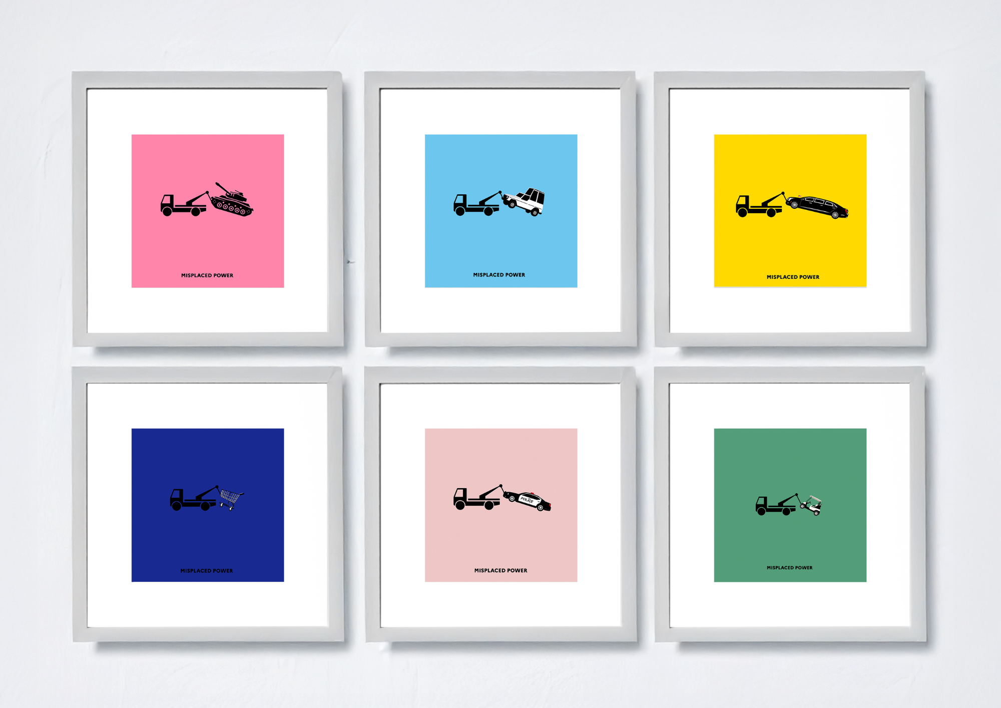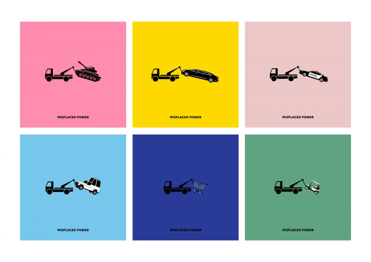 This series of six illustrations takes as its starting point the commonly recognized urban pictogram of a crane towing a wrongly parked vehicle, a symbol of control and regulation in public space. However, rather than depicting an ordinary car, the work reconfigures this scenario with vehicles laden with symbolic power: a war tank, the papamobile, the United States presidential car, a shopping cart, a golf cart, and a police car.