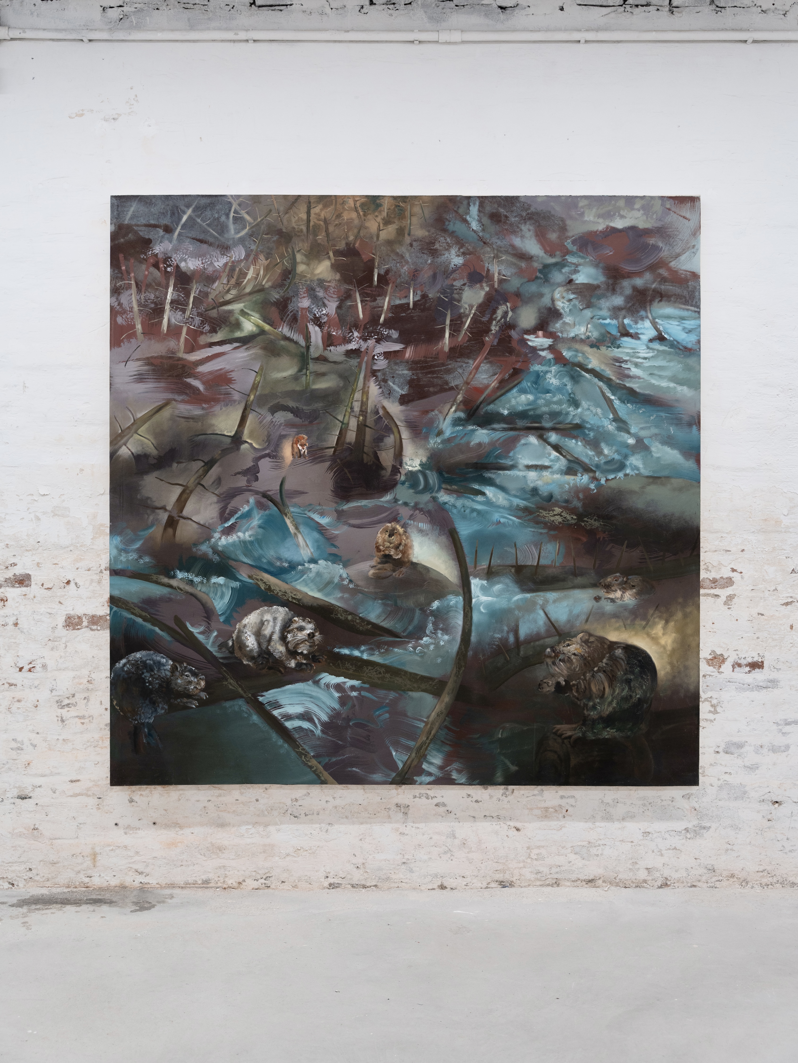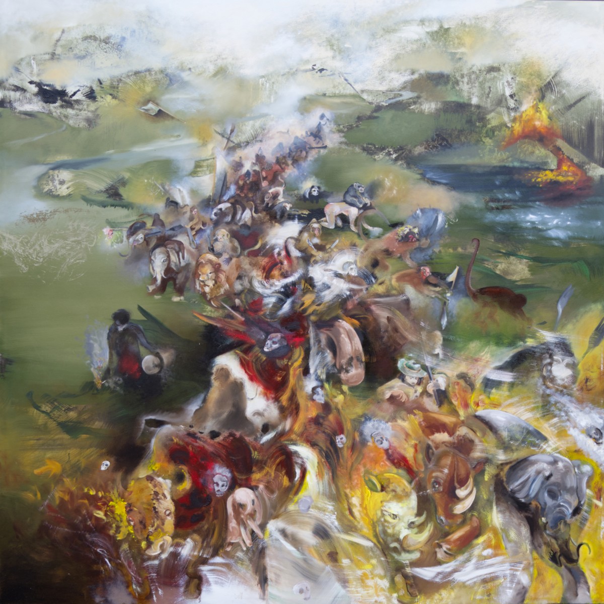 Un’orda di animali di grossa taglia e in preda ad una rincorsa violenta, il paesaggio retrostante viene completamente immerso in un polverone. In questo movimento concitato e scomposto alcune scimmie, in groppa ai propri destrieri, brandiscono bandiere, forchette e coltelli come fossero armi da sfoderare durante un corteo di protesta.