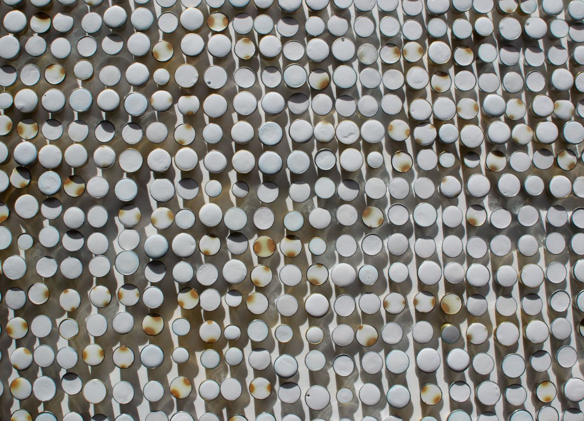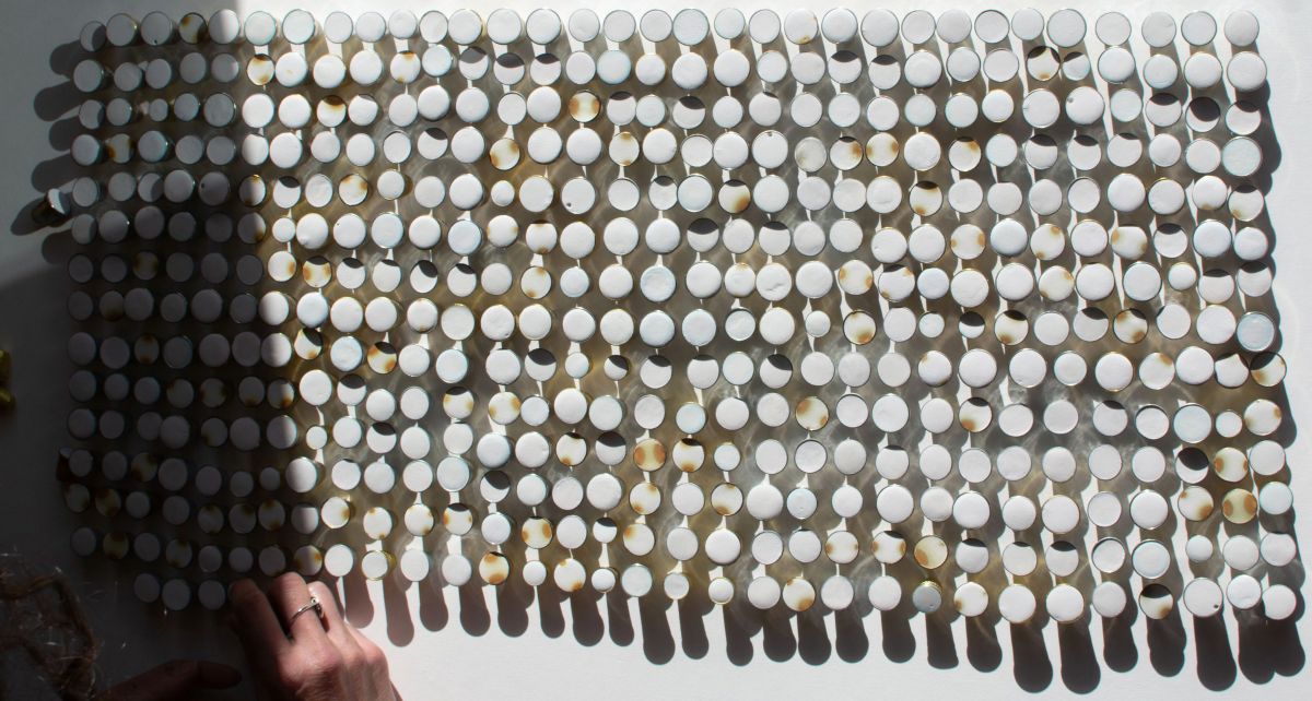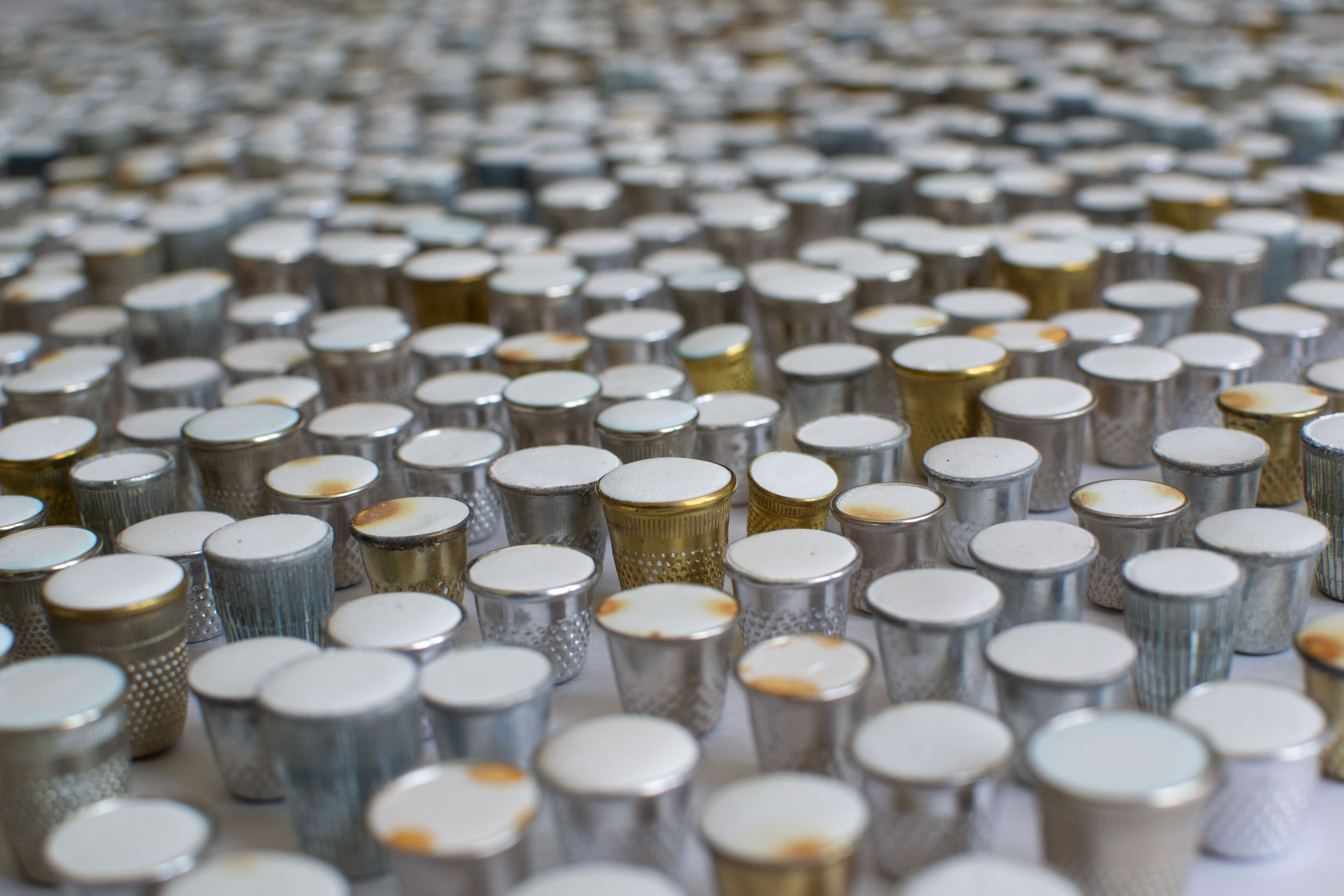 Questa installazione - Voglio una pelle splendida - è composta da più di mille ditali da cucito che contengono gesso che vira di colore dato il mutuo soccorso tra le leghe del ditale e il gesso stesso.