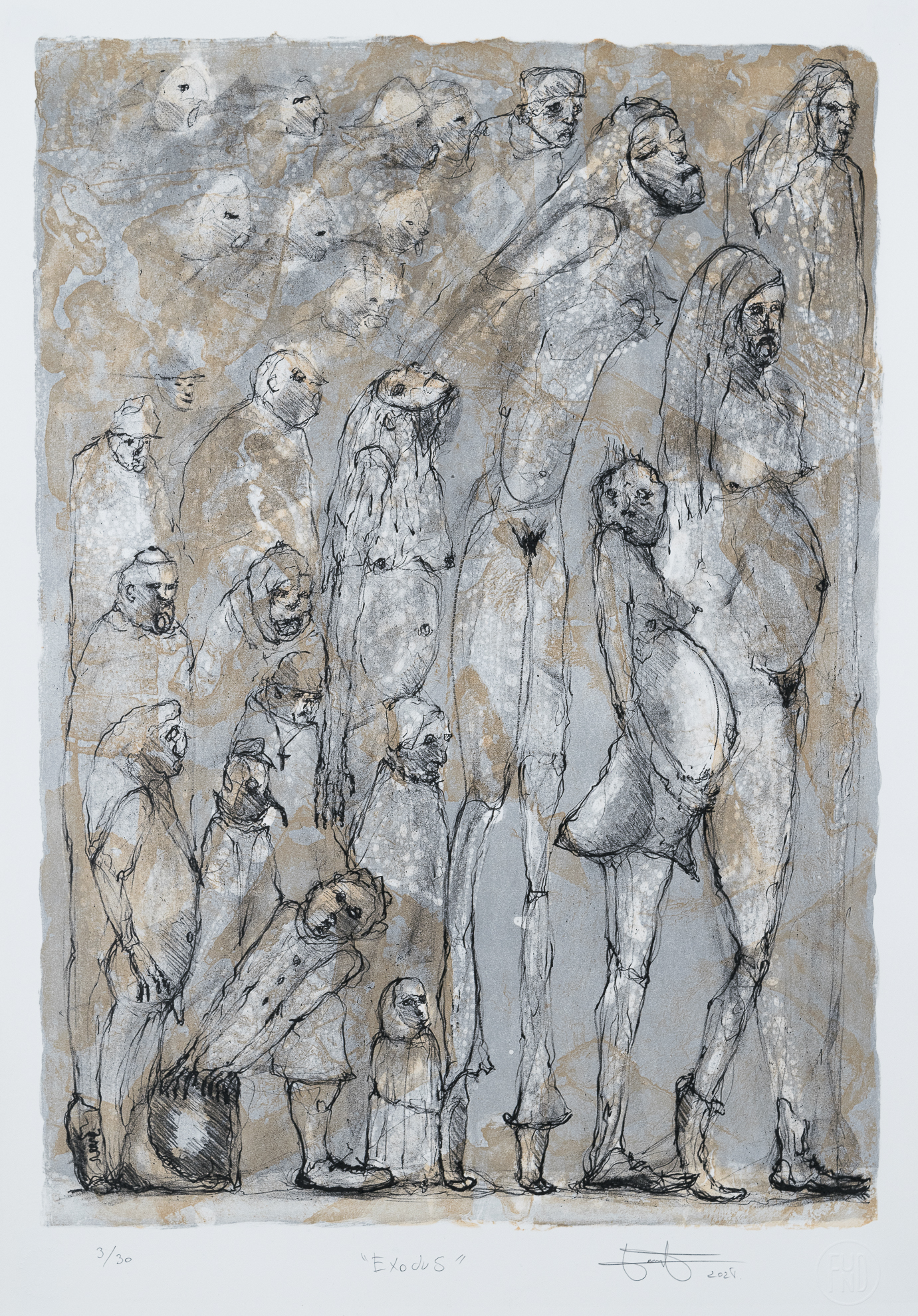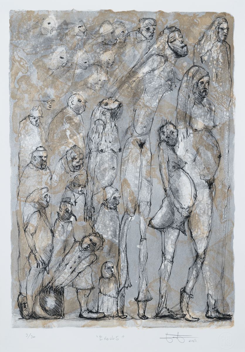 A piece that evokes exodus, migration, exile... the movement from left to right, from death to life. The piece shows a multitude of distinct bodies and faces with diverse expressions, seeking a broad gestural register –like the emotions contained in exoduses– and beings ranging from the most defined to the spectral. Bodies and souls in search of a new home.