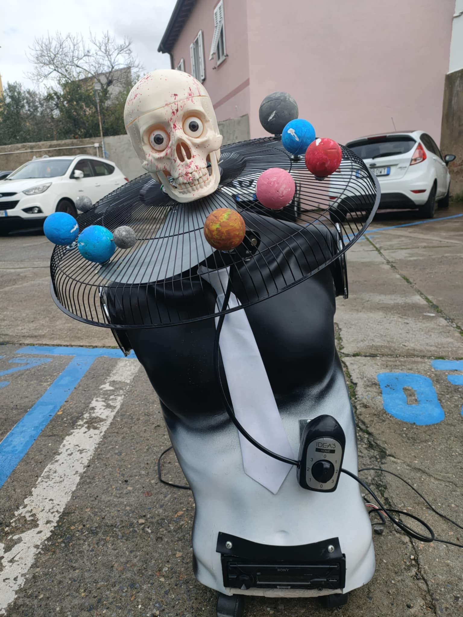 Manichino stereo con casse hai lati delle spalle, con stereo da auto con ingresso usb.