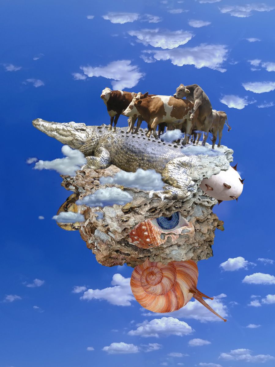 Su questa terra impossibile, un coccodrillo – simbolo di istinto primordiale – diventa il terreno instabile su cui camminano bovini ignari, metafora del ciclo naturale della vita. Un occhio, incastonato in una conchiglia, affiora tra stratificazioni organiche, evocando il rapporto tra sguardo interiore e trasformazione. Una chiocciola, con le antenne direttamente sul guscio, si aggrappa all’orlo di questo universo, simbolo del tempo ciclico e della precarietà dell’esistenza. Un uovo spinoso ribalta l’idea stessa di protezione e nascita, suggerendo una tensione latente tra origine e minaccia.