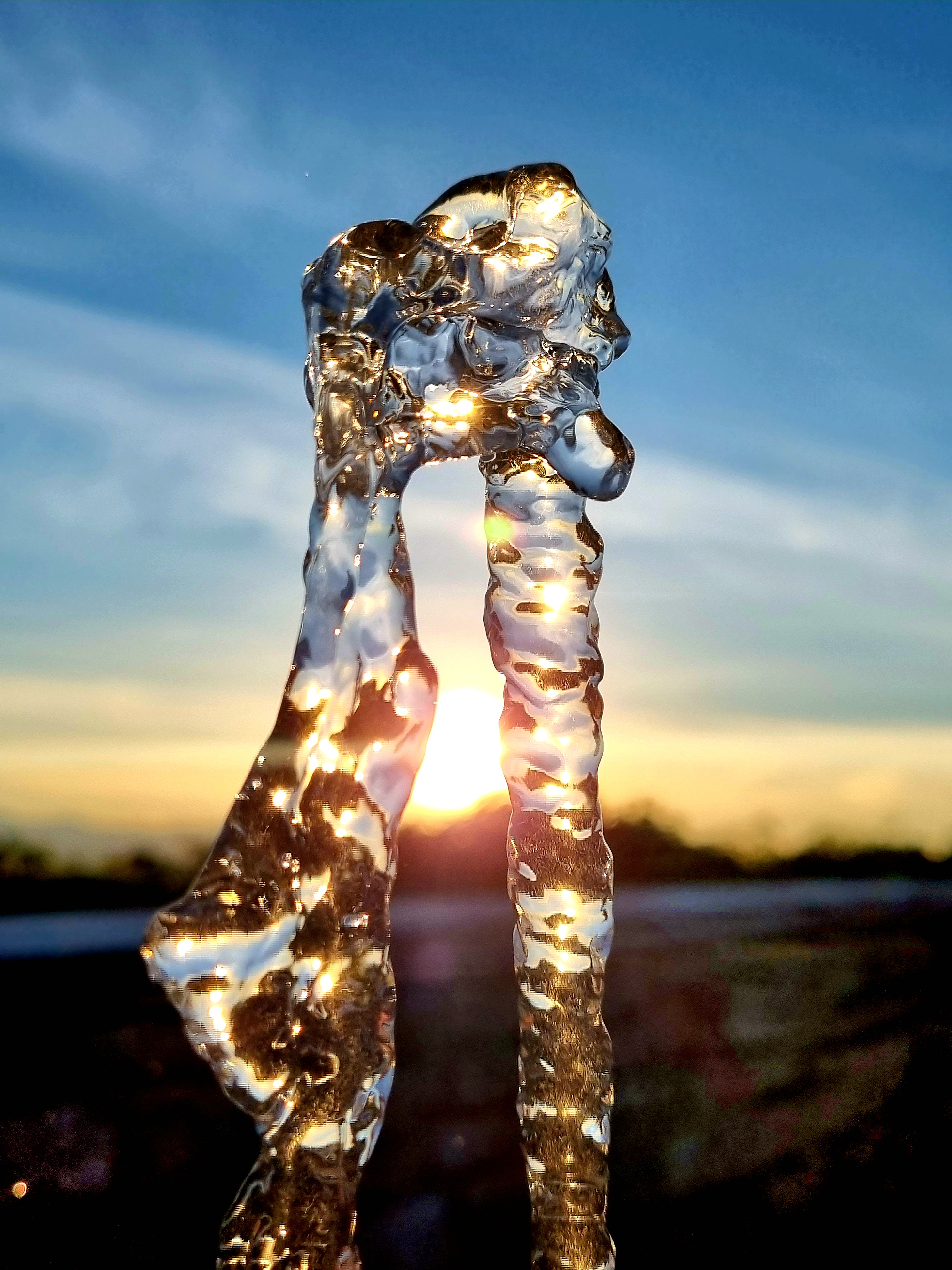 Lo zampillo, baciato dai raggi del sole, risplendeva e fluttuava verso il cielo e in un attimo, come per magia, si è separato generando due figure che ricordano dei corpi, che si abbracciano, che danzano, che si muovono in modo sinuoso ed elegante, terminando con un bacio appassionato.