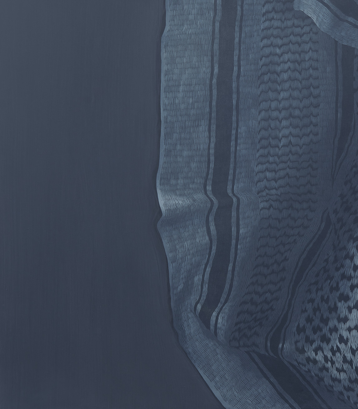 Ecco che lo studio formale sui motivi decorativi dei tessuti dipinti, assume la valenza di statuto genetico di provenienza del corpo assente; ogni intreccio è un dna che diviene presenza concreta solamente attraverso il silenzio della pittura.