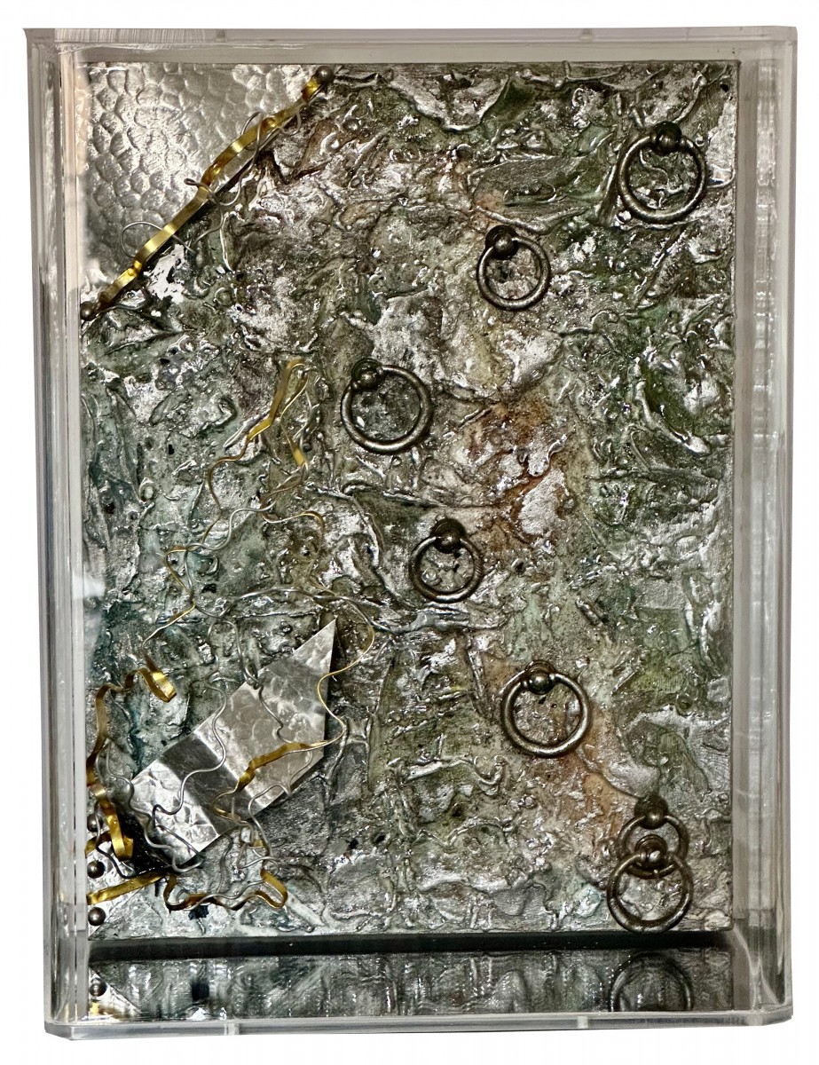 3D OPERA DI ARTE COMPATTA - REALIZZATA SU TELA CON IMPASTI MISTI A COLORI, ALLUMINIO E OTTONE , MATERIALI DI RECICLO. CHIUSA IN TECA DI PLEXIGLASS