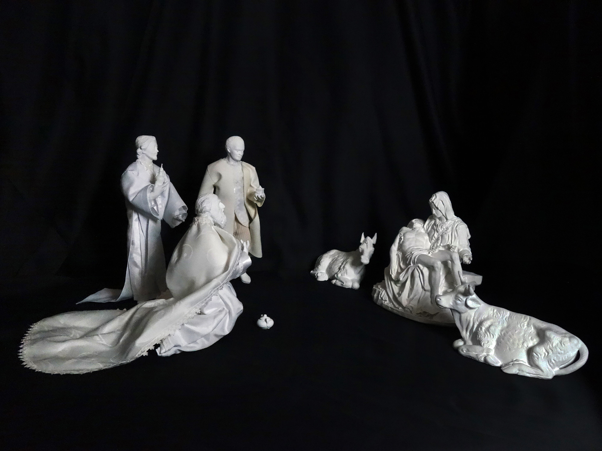 Una riproduzione della Pietà michelangiolesca e cinque altri piccoli pezzi bianchi a completare l’« adorazione », con i Re Magi vestiti di abiti fatti a mano in tessuti preziosi.