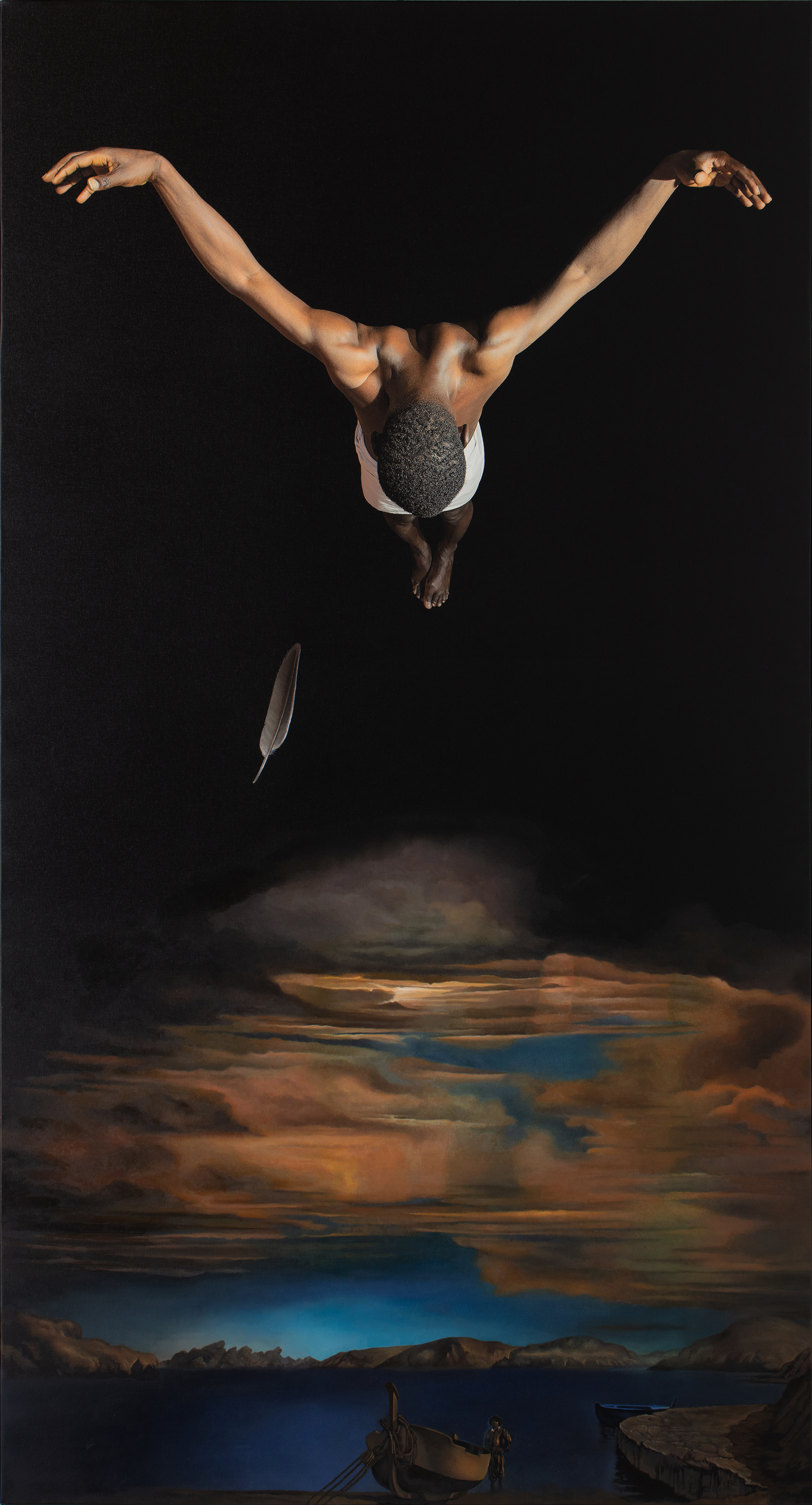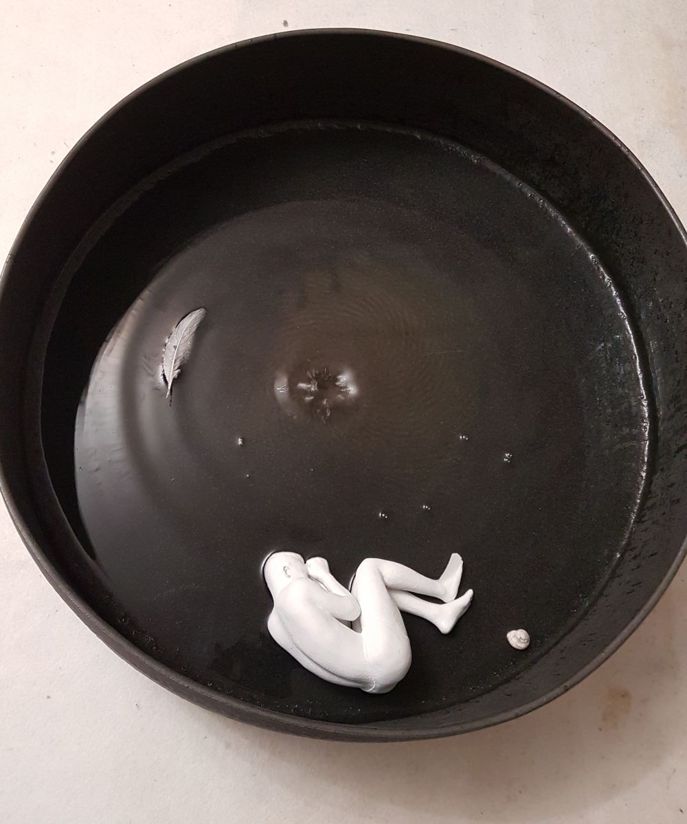 Il ragazzo è immaginato come in una impossibile deposizione sul fondo marino, blu indaco scuro, quasi nero.