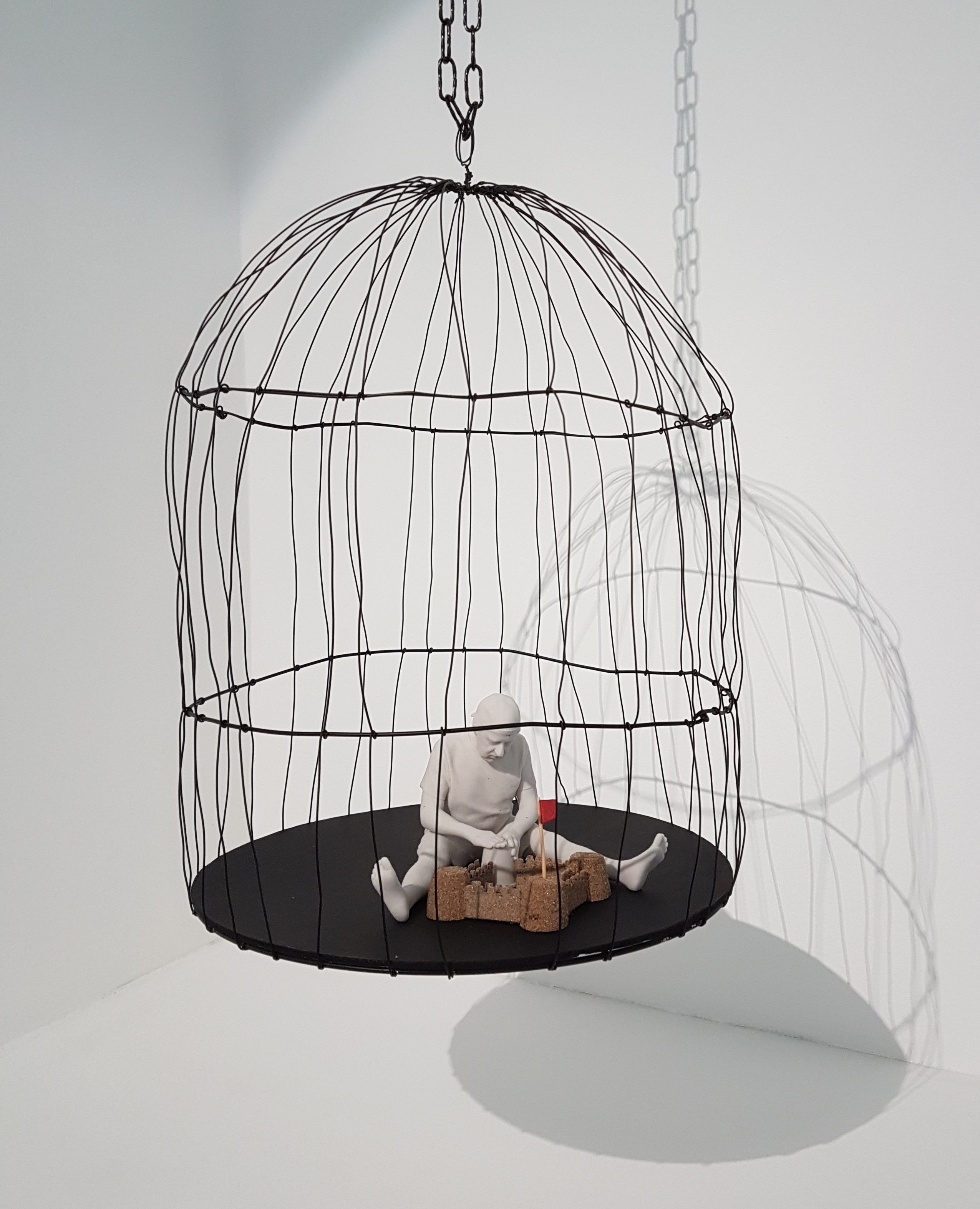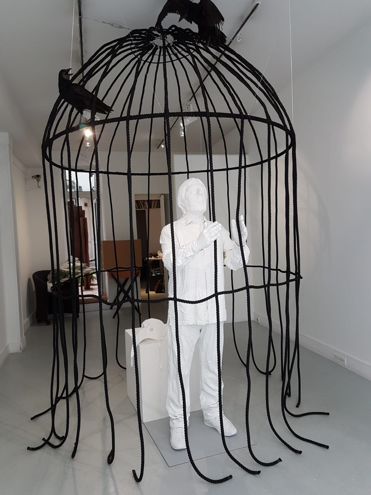 istallazione tecnica mista, resina, corvi impagliati, tessuto, colori acrilici, corde sintetiche, metallo.