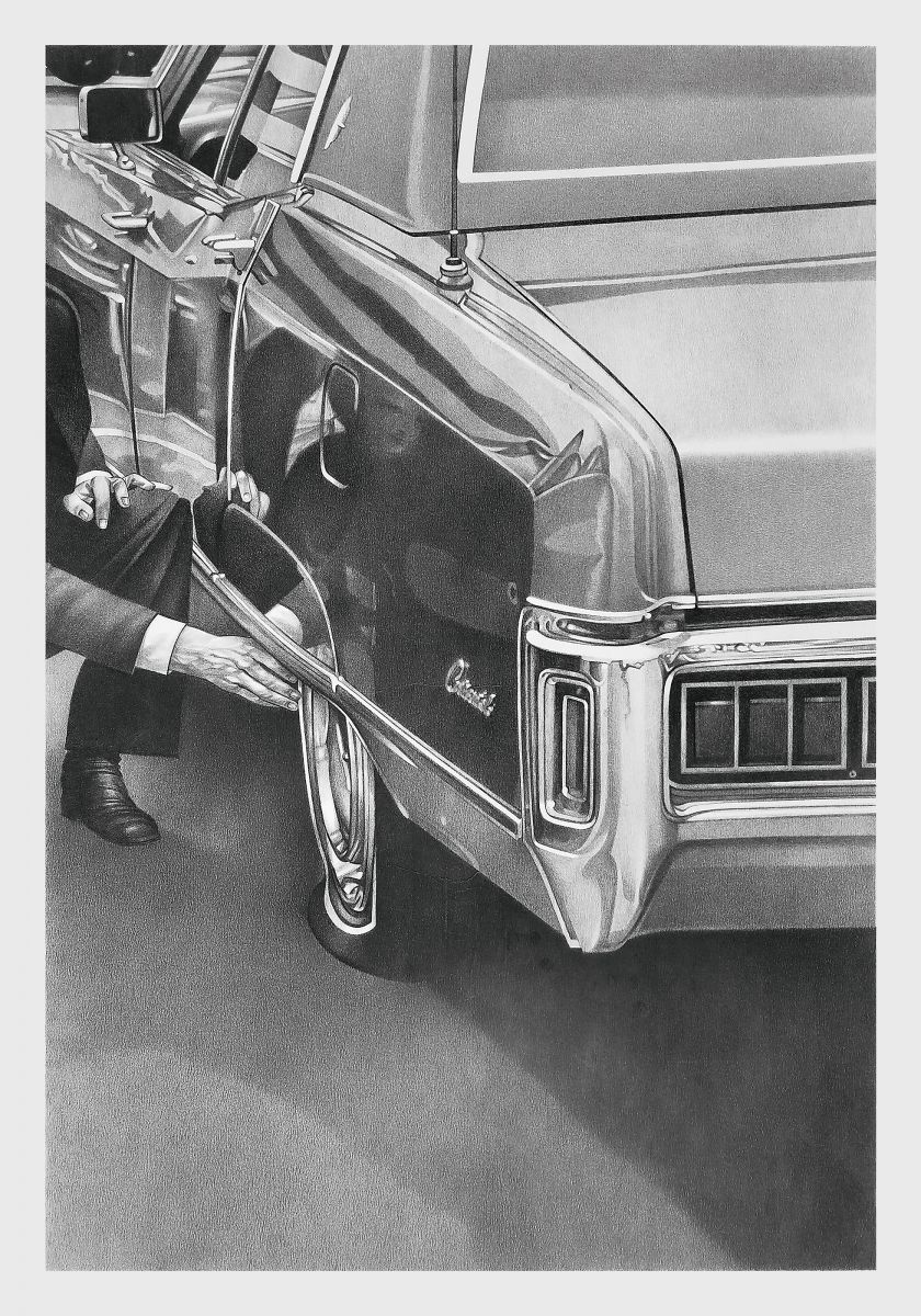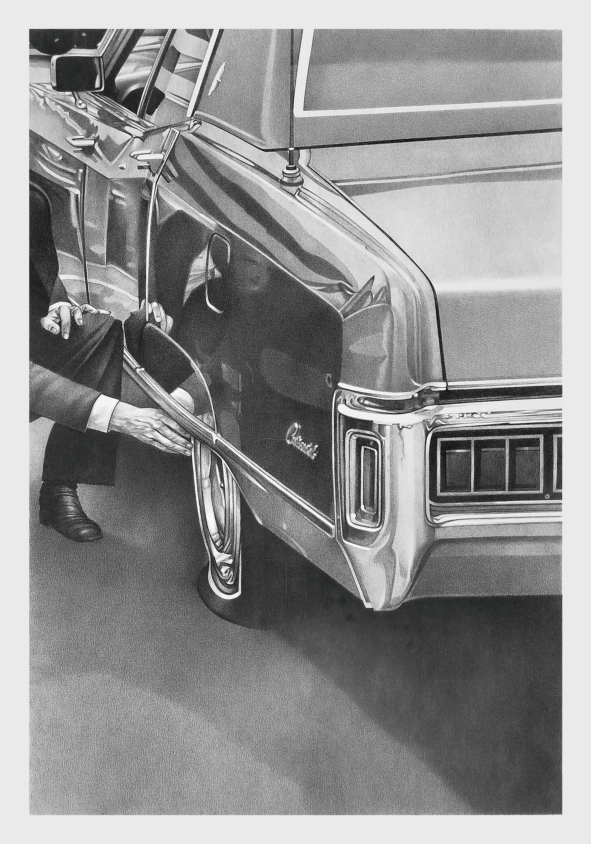 This piece in particular is a part of a series of drawings for which I was awarded with the prestigious „Vladimir Veličković“ Foundation Drawing Award in 2024. It is based on a frame from Jacques Deray’s 1972 thriller film „The Outside Man“ (fr. „Un homme est mort“), starring Jean-Louis Trintignant and Roy Scheider.