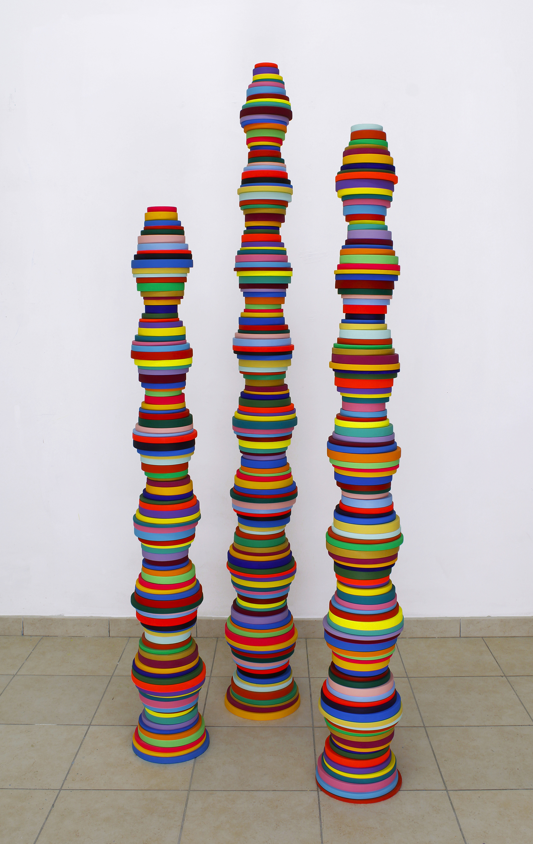I colori, distribuiti sempre nella stessa sequenza ma associati alle diverse grandezze dei cerchi, accentuano il senso di movimento e trasformazione: ogni scultura sembra vibrare su una propria frequenza, pur restando parte di un insieme armonico. L’installazione invita il pubblico a muoversi tra le forme, a percepire le variazioni di scala non solo come misura fisica, ma come metafora del cambiamento e dell’ evoluzione che proprio nella ripetizione genera differenza.