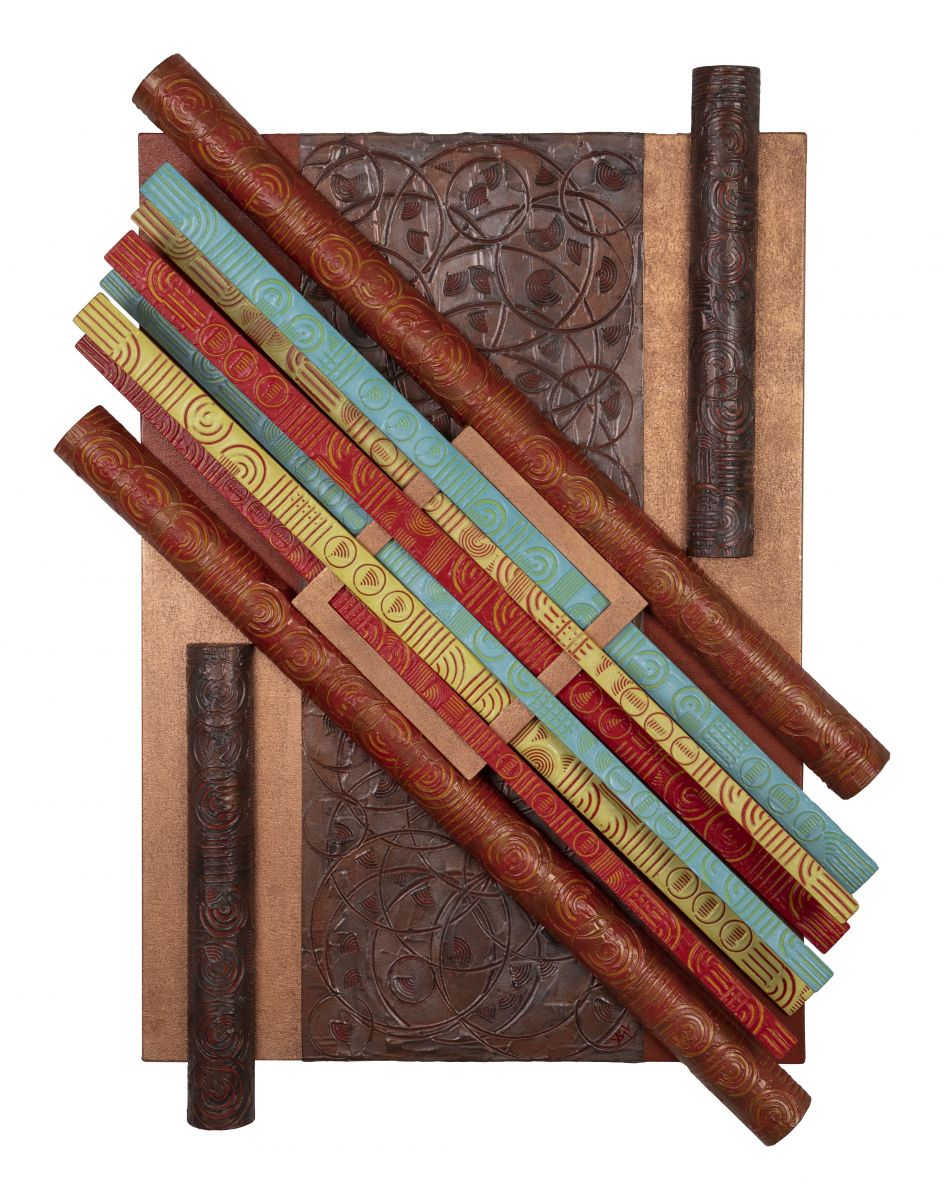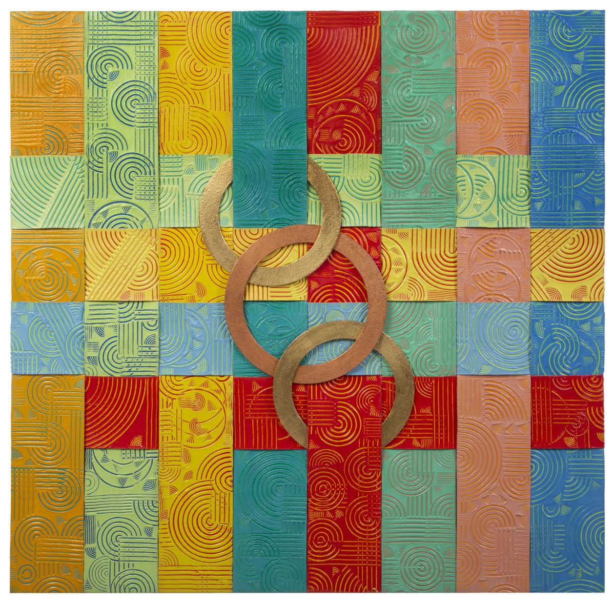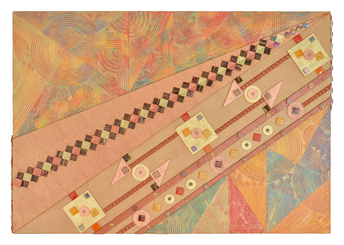 L’opera fa parte di una serie intitolata: “INTRECCIO GEOMETRICO”. In questa opera la particolarita’ sta nelle 12 strisce di tela che sono state decorate con resina e colori acrilici per dare tridimensionale alle stesse, dopo di che sono state intrecciate tra loro con l’inserimento di anelli in legno trattati con la foglia oro e rame, il tutto adagiato su base in MDF. Il risultato finale è un’opera geometrica che insieme alla materia è caratterizza la mia tecnica artistica.