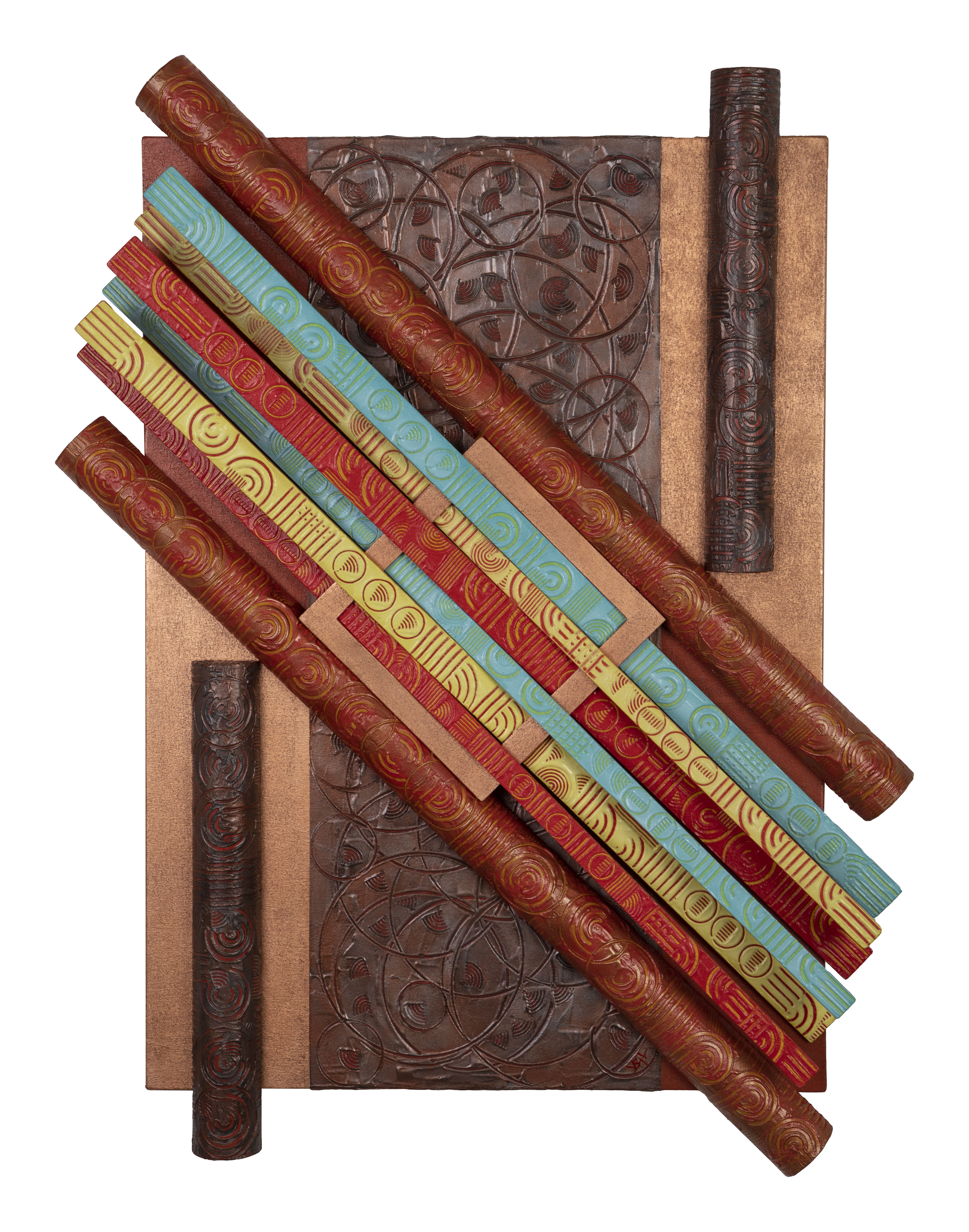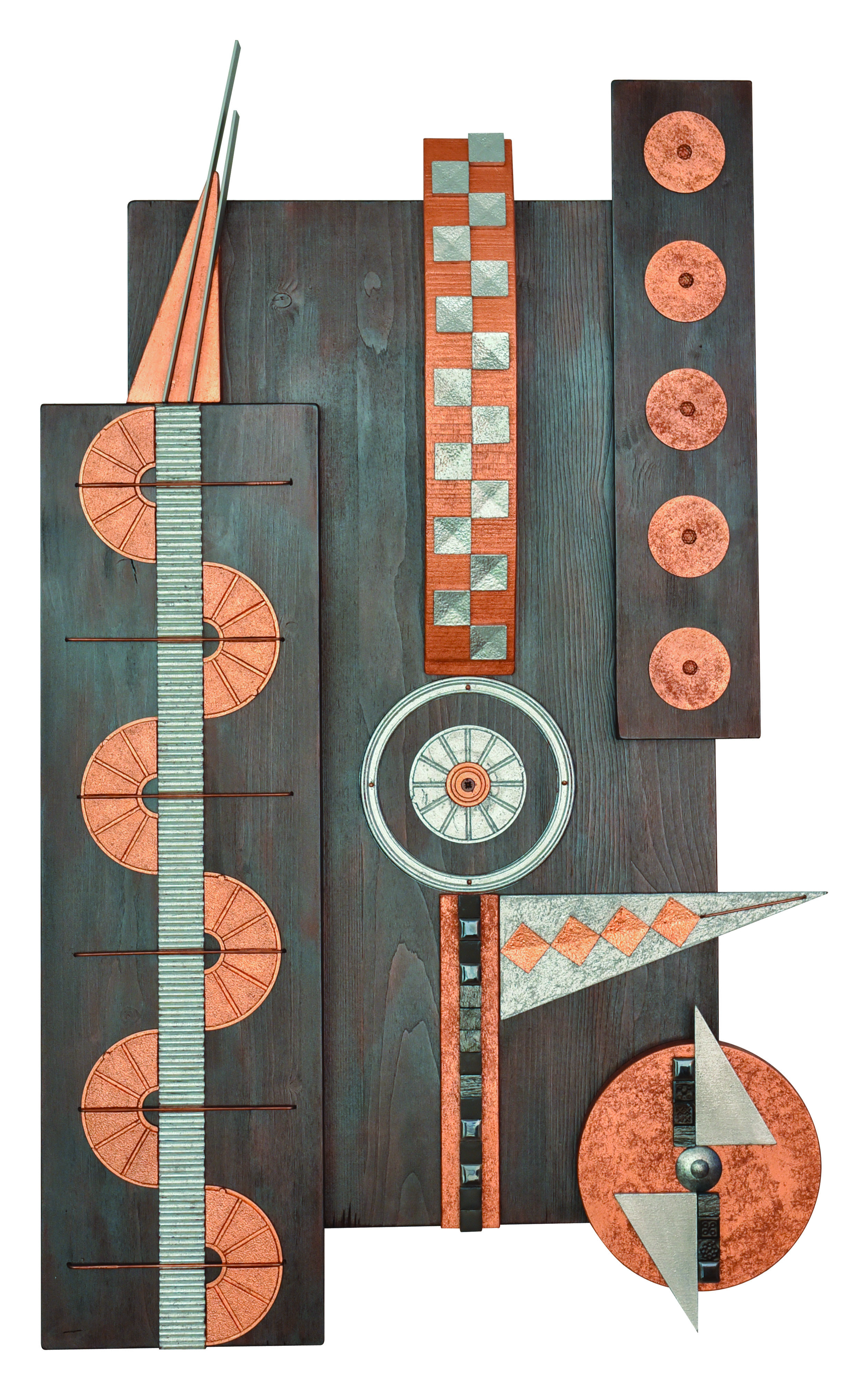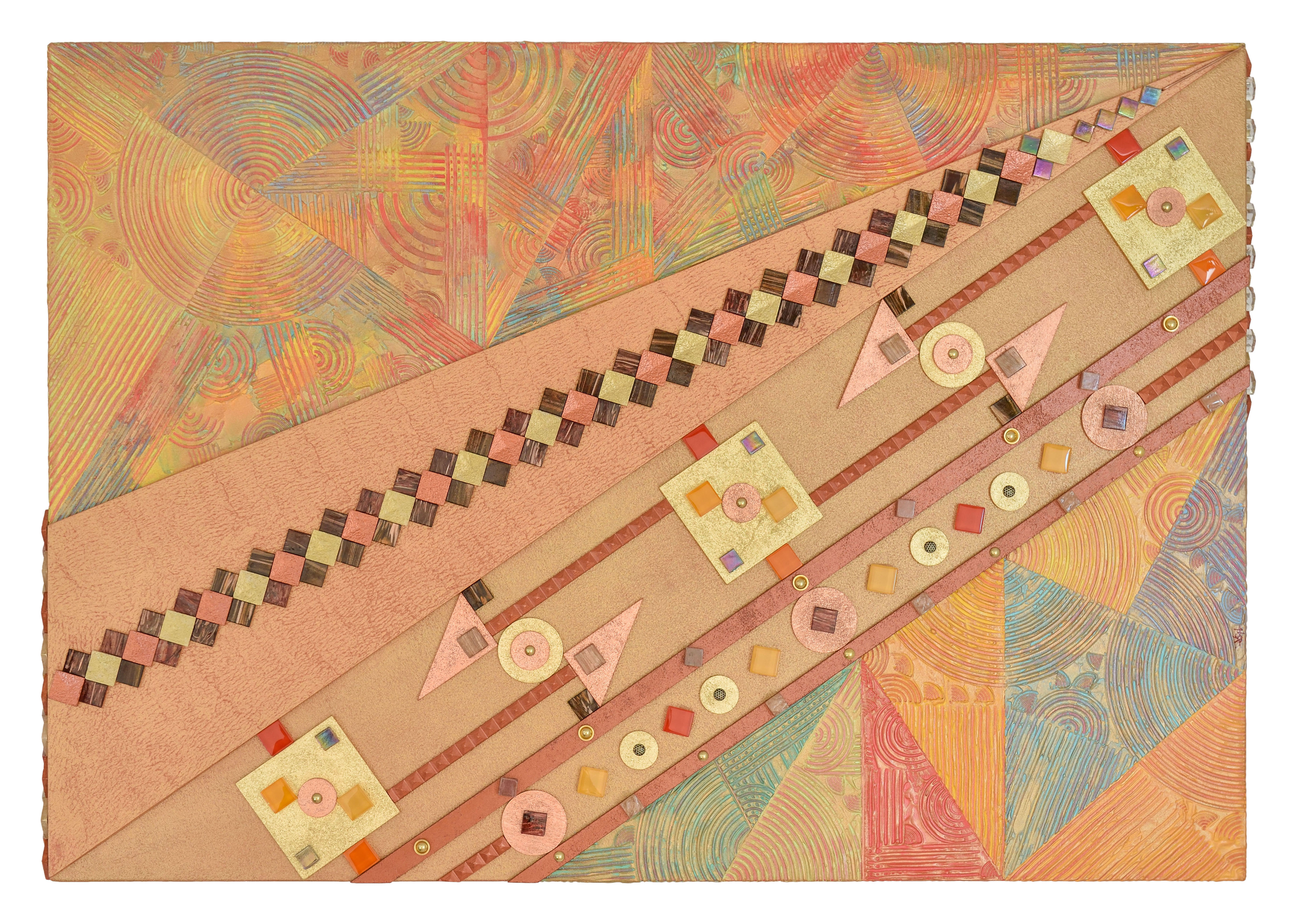 L’opera fa parte di una serie intitolata: “INTRECCIO GEOMETRICO”. In questa opera la particolarita’ sta nelle 12 strisce di tela che sono state decorate con resina e colori acrilici per dare tridimensionale alle stesse, dopo di che sono state intrecciate tra loro con l’inserimento di anelli in legno trattati con la foglia oro e rame, il tutto adagiato su base in MDF. Il risultato finale è un’opera geometrica che insieme alla materia è caratterizza la mia tecnica artistica.