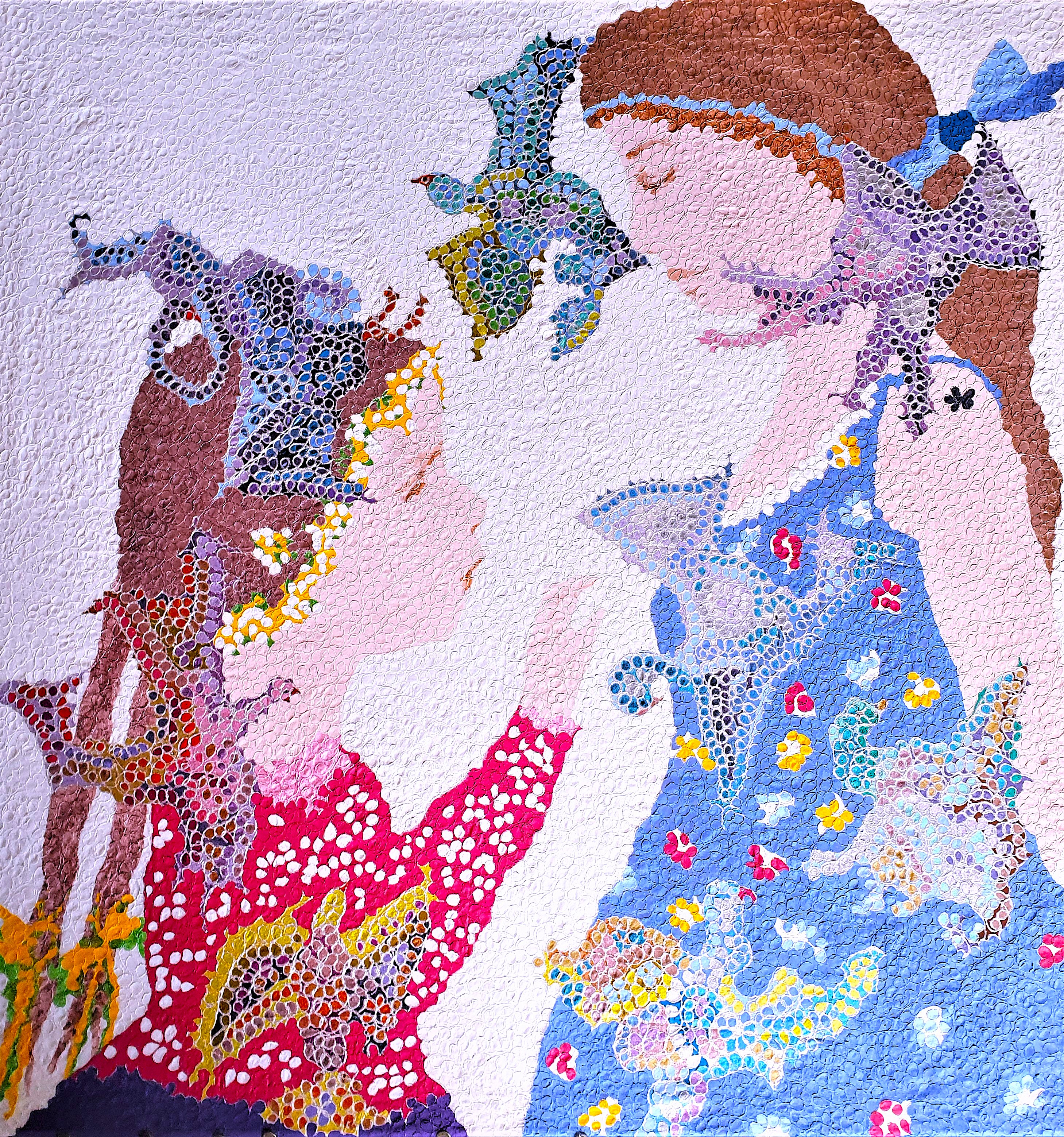 I started with my silkcanvas scattered with shiny threads and in my imagination saw birds flying around. Then I started painting and crazy, colourful and alien birds came popping up on my canvas. I created them with small shiny, sparkling round areas of colour. They spread all over myj canvas. It started with a swan, then a dancing bird, a butterfly- and seahorse bird. Also a candy bird, a magic ball- and a ghost bird apeared. A young girl saw these amazing birds and wonderd what they were. She turned to her mother to ask for anwers. The mother told her lovingly that the birds came flying from another world, a fantasy world where everything is beautiful, colourful and hopeful. She is telling her daughter to continue to cherish that world, a world ful lof imagination, hope and love that all children still have but often forgotten when getting older.