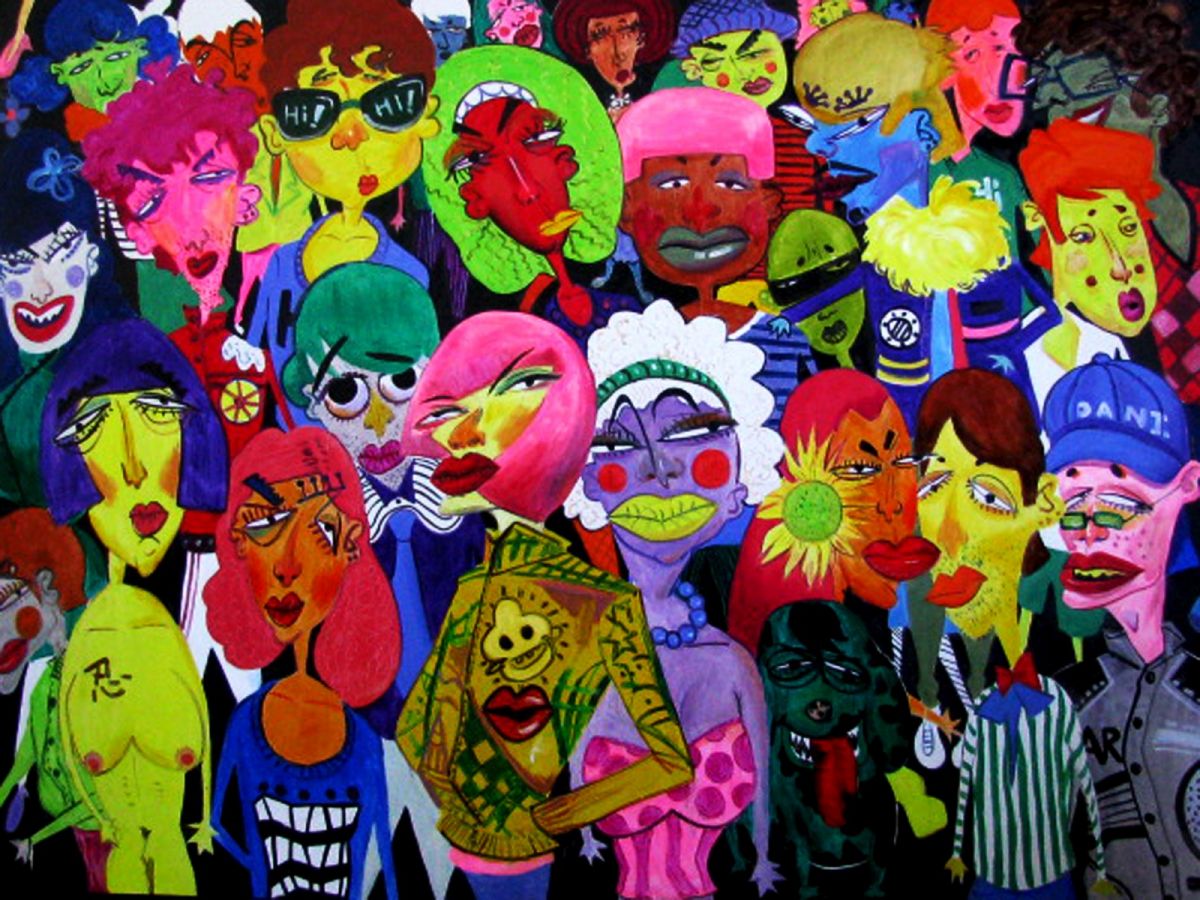 Il video presenta un ordine razionale, mentre il dipinto raffigura un gruppo di “persone” dai volti esagerati e dalle espressioni sconvolte. Questi individui sono immersi nel proprio mondo, come se stessero dicendo “Ciao!”, ma questi saluti sembrano più un rituale sociale vuoto che un vero tentativo di comunicazione. Ogni figura è avvolta da una forte coscienza di sé, con espressioni, abiti e posture fortemente individualizzati, a volte persino bizzarri, ma senza alcuna reale interazione tra loro.
