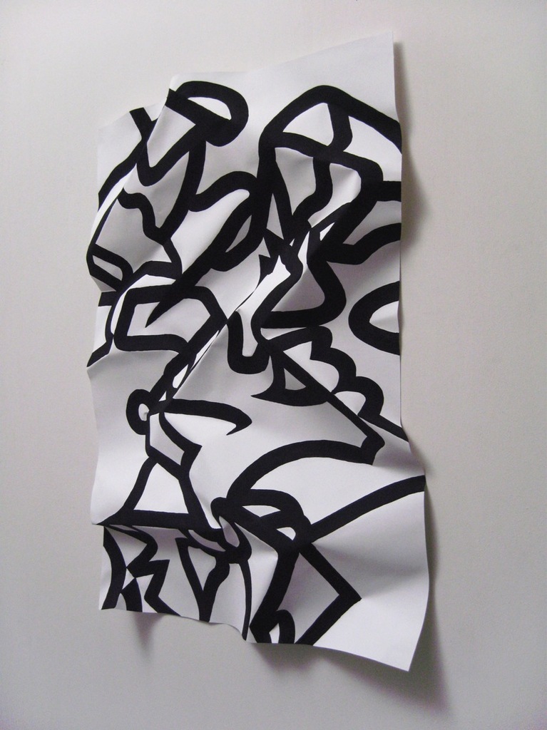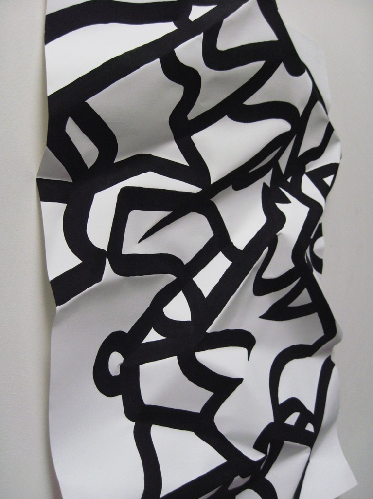 Crumbled N7 fa parte di una serie di lavori che elabora una radicale pratica decostruttiva del linguaggio pittorico, identificando nel difetto di un’azione deturpante ed incontrollata lo strumento d’indagine per nuove soluzioni estetiche formali. Il fragile supporto di carta, rivestito di pittura bianca, è bistrattato, maltrattato e accartocciato per poi essere riaperto e rimarcato in tutte le sue asperità con un tratto di pittura nera che ne ricalca per intero la nuova morfologia della superficie, generando una texture da ciò che comunemente viene visto come una imperfezione.Tale “difetto” è visto non soltanto come ruga di carta ma come conseguenza d’ombra, che apre una nuova polarità tra illusione (pittura) e realtà (luce).