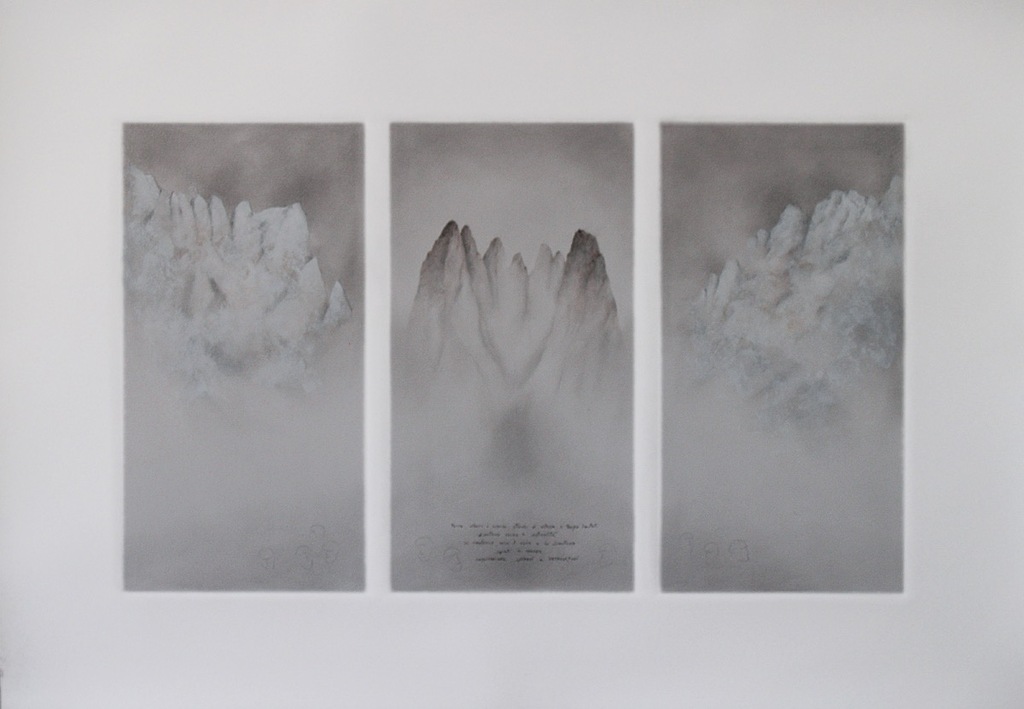 Trittico su carta: ”terre, alberi e uomini, stanchi di altezze e tempo limitati, diventano roccia e verticalità, si innalzano verso il cielo e lo diventano, spiriti in essenza. Sublimazione, Catarsi e Metamorfosi”.