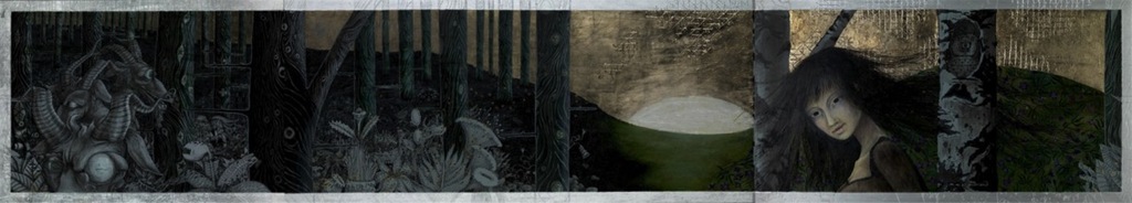 Black book is the first picture from the serial of paintings about human search for purpose in life. It all began with an old Persian story written by Nizami Ganjavi in 1197, ”Seven Beauties”, the adventures of Bahram Gur, a prince destined to become the ruler of the world. Seven Beauties is a literary classic in both the East and West - an erotic allegory about the quest for human perfection. Book unveiling ancient knowledge from sufism and Zoroastrian/Mithrean mythology. Nizami wrote the most perfect literary expression of the scheme of the Seven Colours. In his romance of spiritual initiation, the Haft Paykar he equated the seven colours of the universe with the seven metals, the worlds seven climes, the seven planetary spheres, the seven days of the week, and the seven tinctures of the soul. The origins of Nizami’s seven - tinged perception of the universe went back very far. They may be traced to ancient Mesopotamian cosmologies.