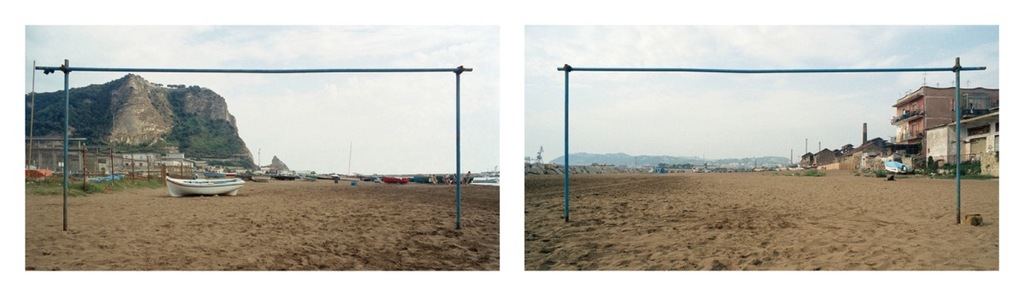 Fuoricampo è una serie di fotografie realizzate a Napoli. Ho inquadrato il panorama attraverso le porte dei campetti di calcio improvvisate ”abusivamente” dai ragazzini nei quartieri periferici, sugli sterrati, sui “terraine vague”, in quei margini di territorio lasciati vuoti dagli urbanisti e dai progettisti.E’ però anche un lavoro che ironizza su Napoli, mia città natale, sul tema delle periferie urbane, e in ultima analisi sul tema della fotografia di paesaggio.Questo lavoro è il frutto di un’indagine commissionatami dal comune di Napoli sulle sue periferie. Dai miei numerosi sopralluoghi è emerso che la maggior parte dei cosiddetti “terraine vague”, di cui parlano gli urbanisti e gli antropologi, non sono assolutamente vaghi. Il territorio periferico è costellato da campetti di calcio autocostruiti con materiali di recupero, tubi innocenti, pali di legno, eccetera. Se ne deduce che in tali aree non si può parlare propriamente di abbandono perché invece spesso proprio questo territorio è sottoposto ad un controllo continuo.Con un criterio rigoroso, ho fotografato il panorama che le due porte di calcio inquadrano. I due paesaggi, incorniciati dalle porte, sono uno di fronte all’altro, eppure completamente diversi. Ho scelto un metodo, una lente, o meglio, un mirino attraverso il quale guardare la realtà. Non ho voluto porre alcun tipo di scelta d’inclusione o d’esclusione, il bordo predefinito dalla conformazione delle porte ha coinciso con uno sguardo privo di valori gerarchici.