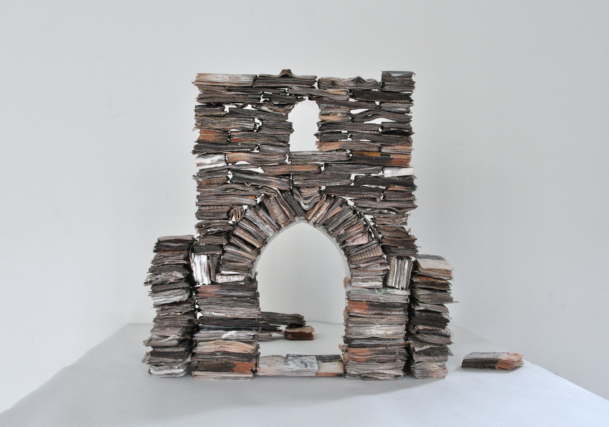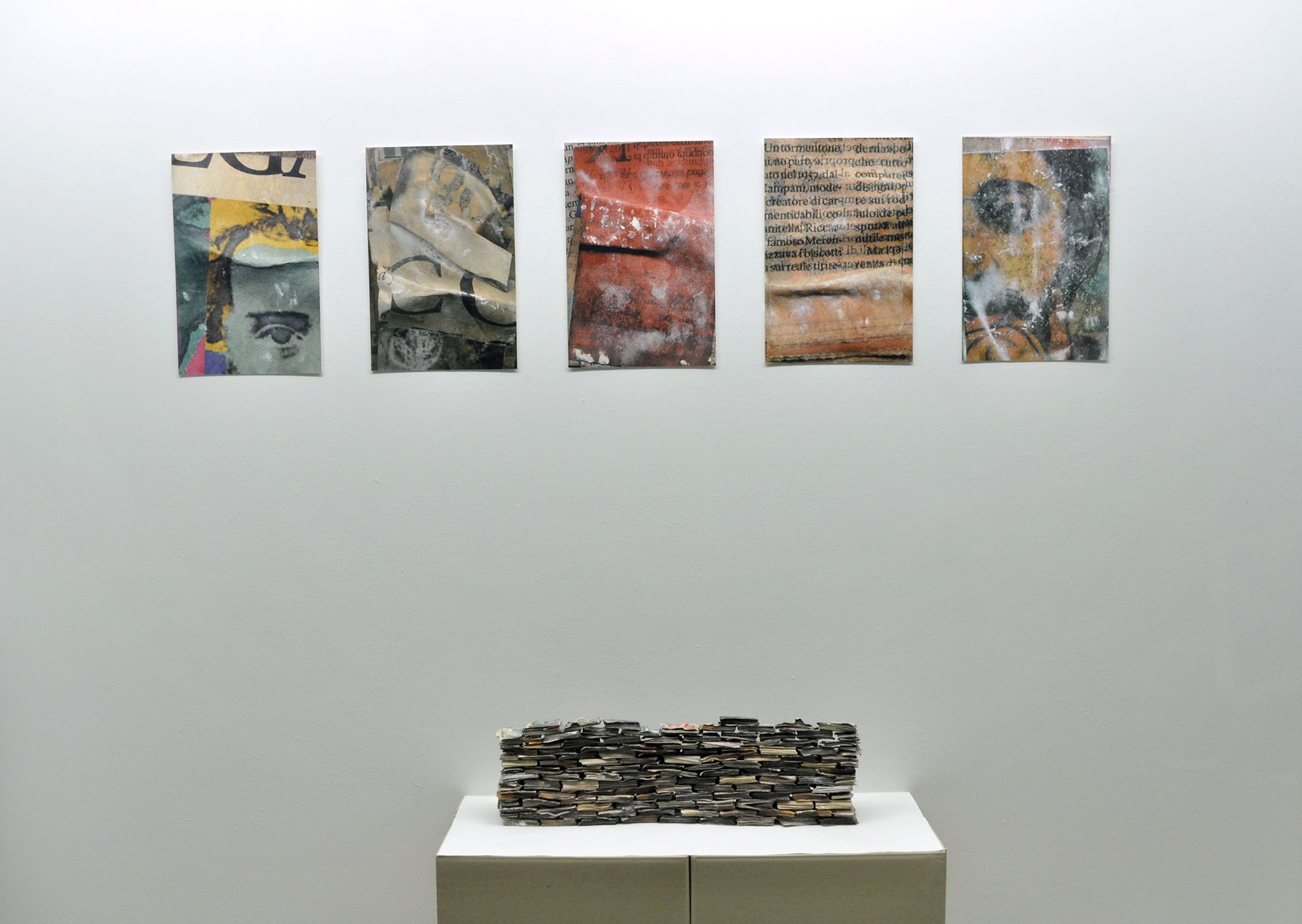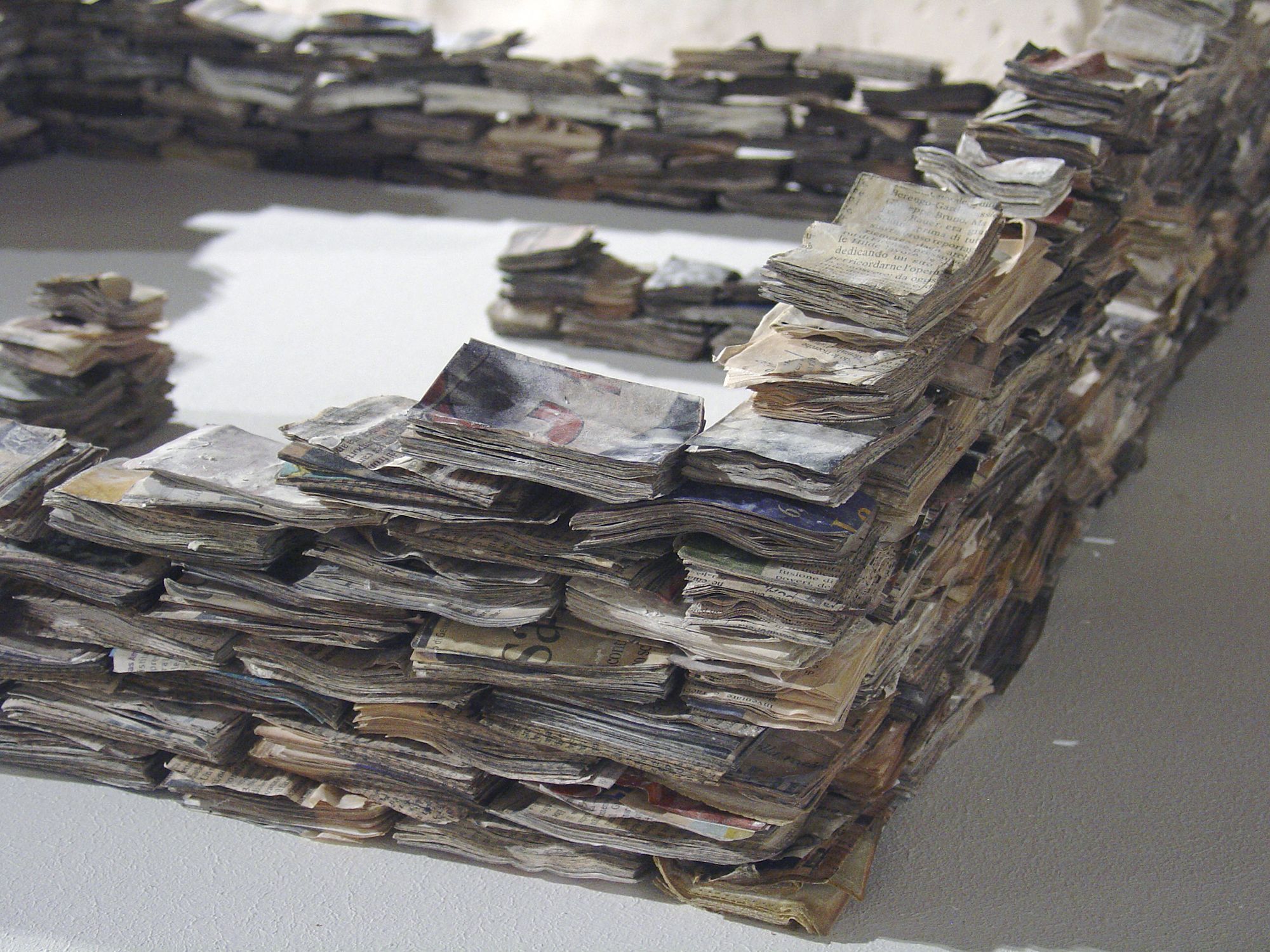 mattoncini di giornale (3 x 6 cm ogni) trattati con gesso e colla lapin, resina acrilica dimensioni variabili, giornali