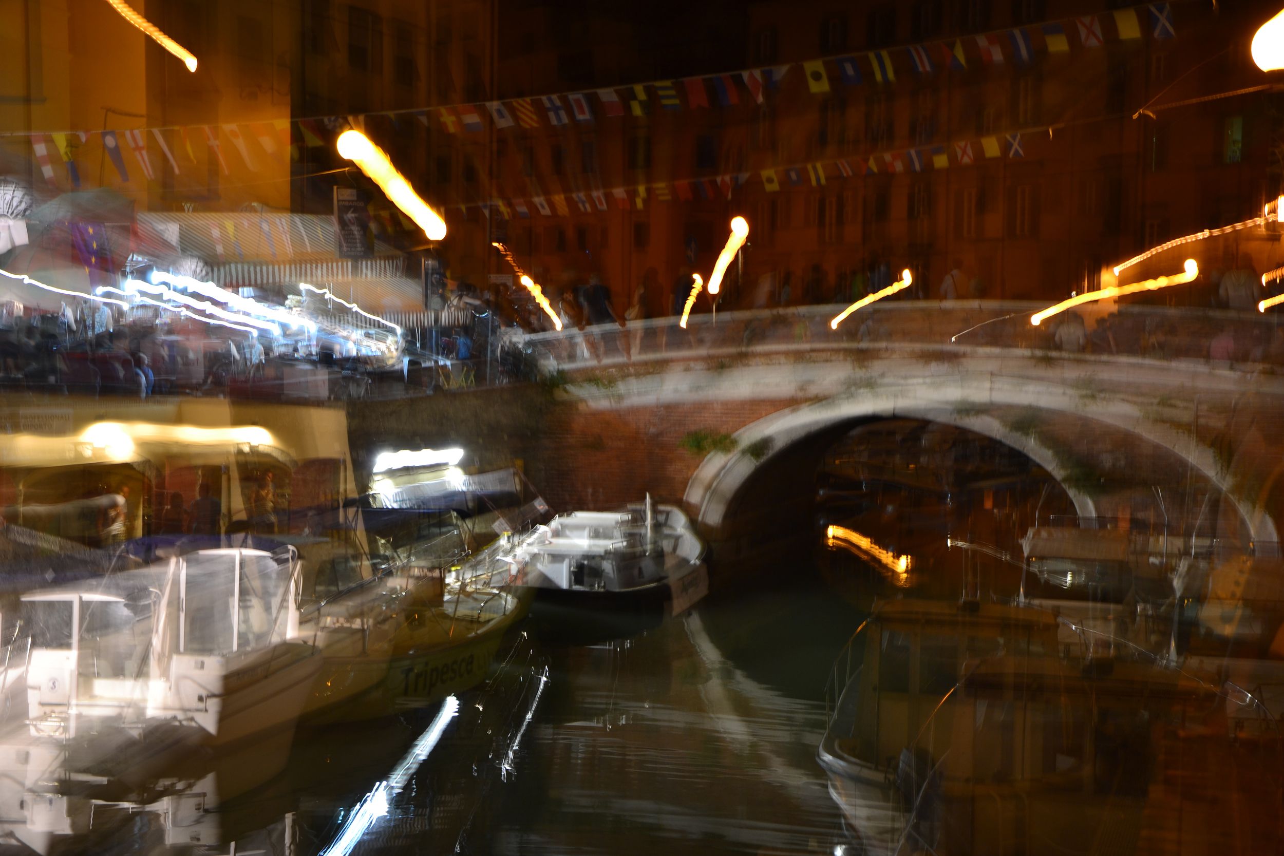 In questa foto è stata riutilizzata la tecnica dello zooming che riporta uno scorcio della Venezia Livornese illuminata a festa, distribuendo con effetto etereo e poetico i colori delle imbarcazioni che in altri momenti avrebbero deturpato e stonato vicino alle storiche mura medicee.