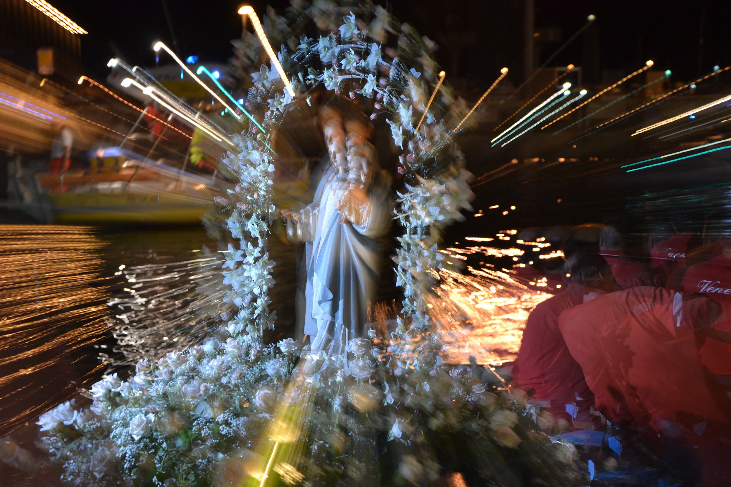 Anche In questa foto la tecnica dello zooming fa emergere la statua della Madonna portata in processione acquatica. L’equipaggio di vogatori storici del Venezia con le loro maglie rosse umide di sudore, l’acqua del mare, le luci proiettate dal movimento voluto e i colori ne fanno una degna cornice.