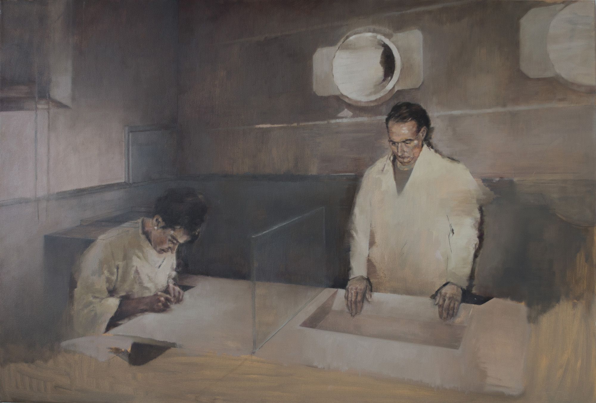 My work expands over the media of painting, drawing and sculpture, through which I explore the connection between history and memory. I use architecture as a primary vessel for my concerns, exploring its significance as a record of history and social development and speak directly of our public awareness and aptitude towards political and social devices. In my work, architecture functions as a mnemonic device, which investigates the metaphysical process of how fragmented memory can envelop and disorientate one’s reality. The constructed spaces and furnishings are predefined for self-reflection, while at the same time exerting a power over thought and gesture of the figure. The figure in my work takes on a diagrammatic role within its environment, indicating the structure’s function to the viewer. I am preoccupied with geometric environments existing within a figure-space relationship and the intimacy that arises between them. Void of any reference to time and space, I aim to draw attention to our nostalgic relationship with our surroundings and their ability to become an obstacle in our existence.