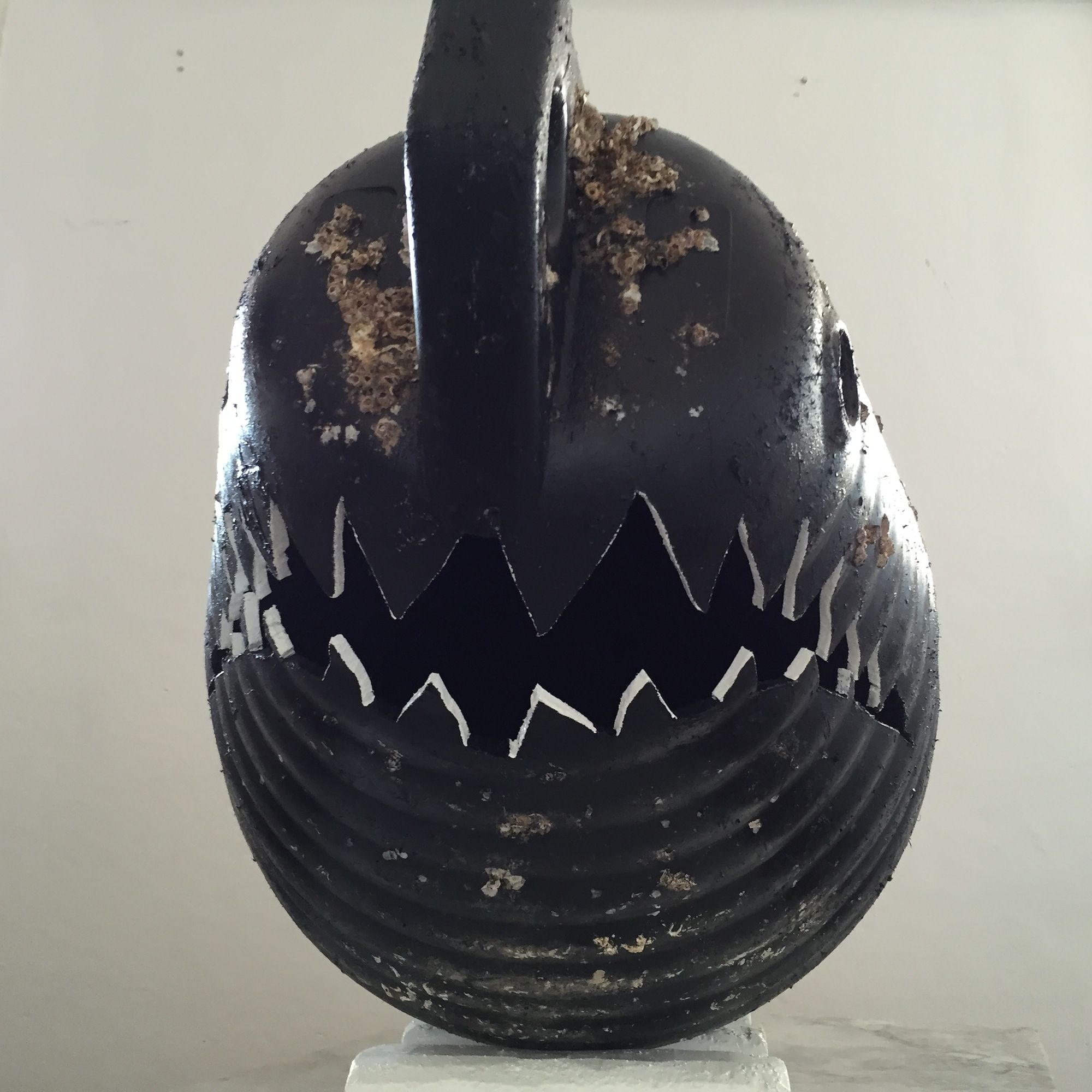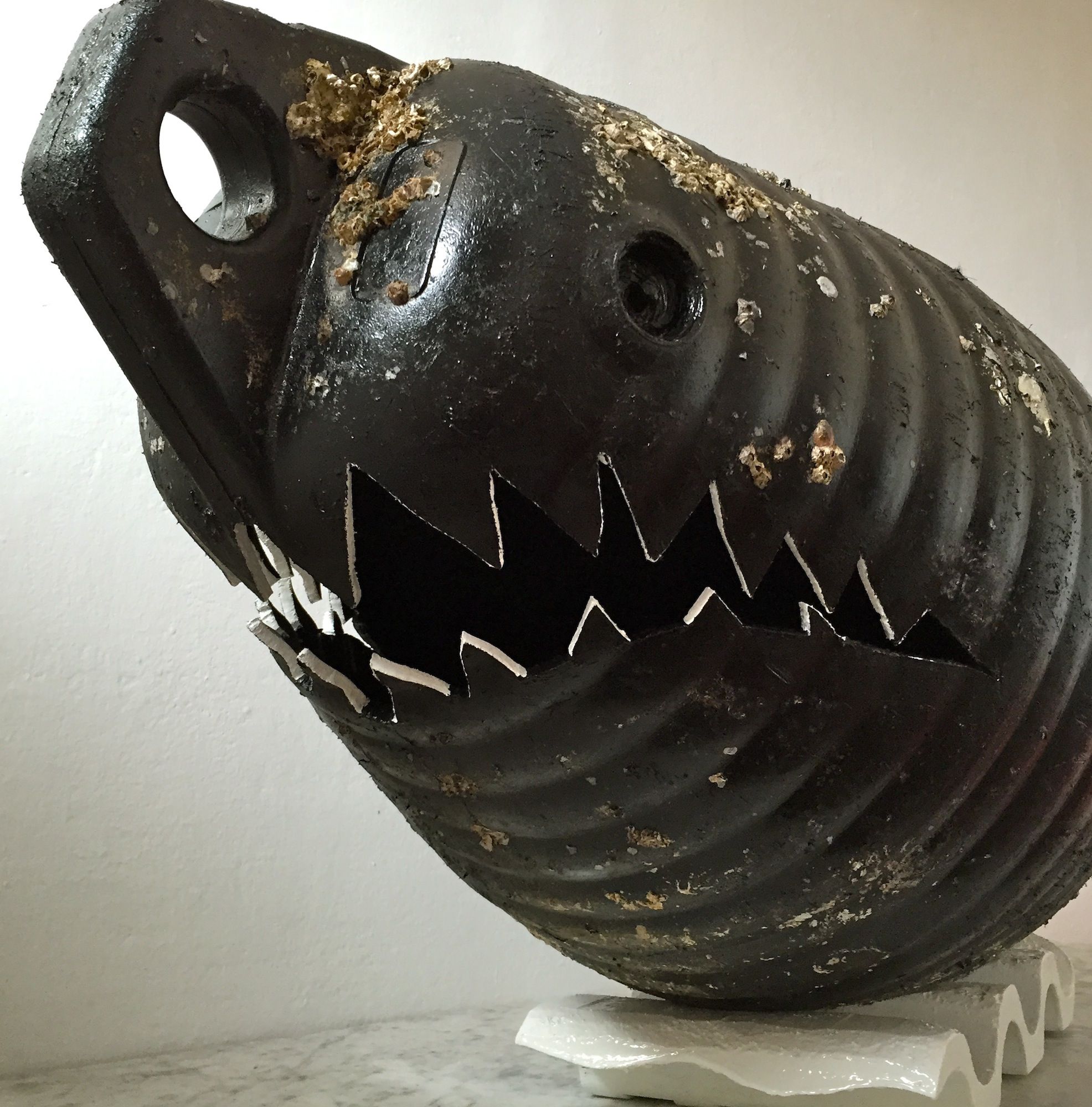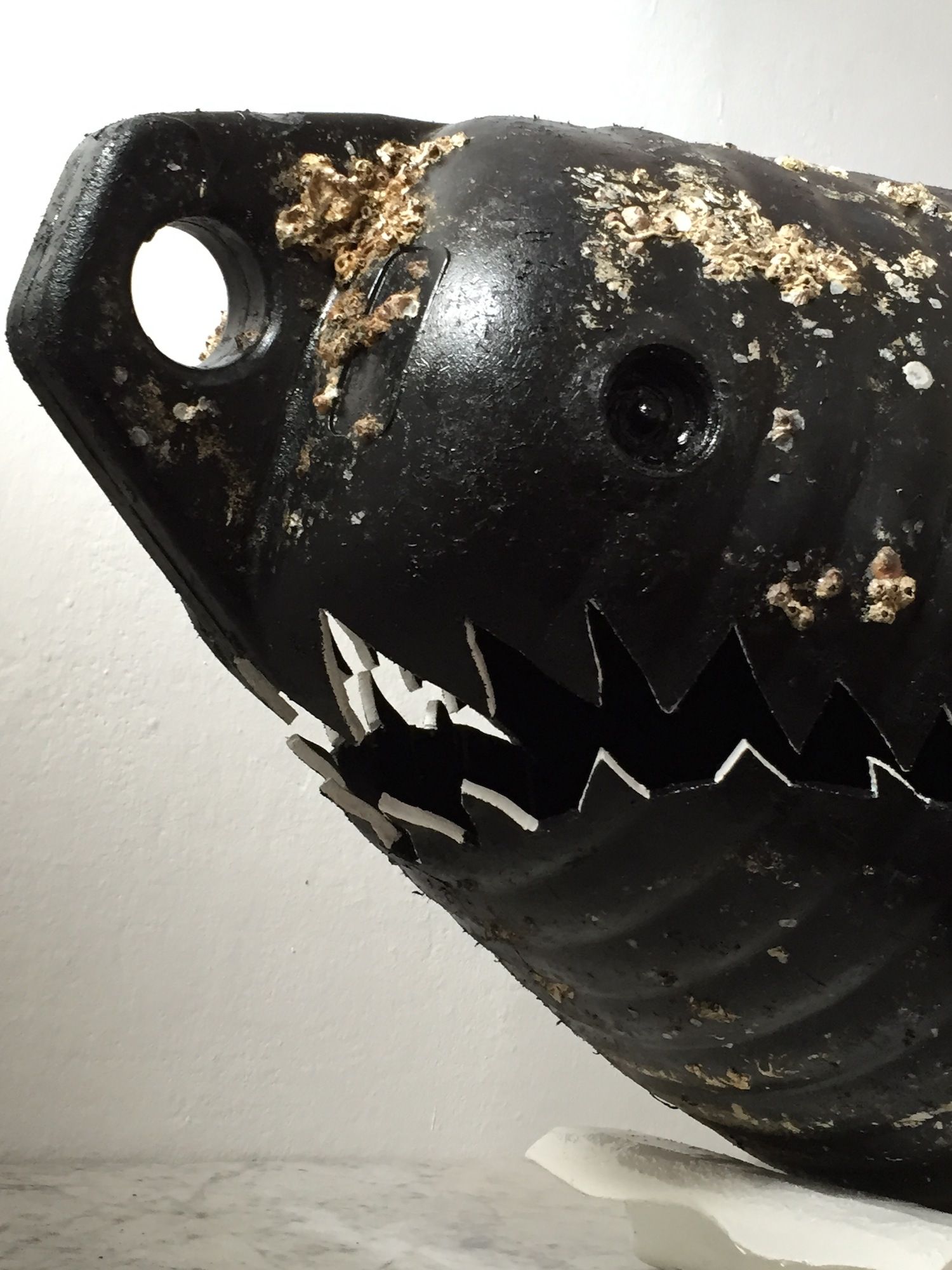 Tecnica e materiali: Scultura-Installazione realizzata con una boa ritrovata su una spiaggia ritagliata in modo da formare la bocca e i denti dello squalo. La coda è invece realizzata con un supporto di ferro rivestito con cime cave, dette ’calze’, generalmente usate per appendere i parabordi. Anno di realizzazione:2015