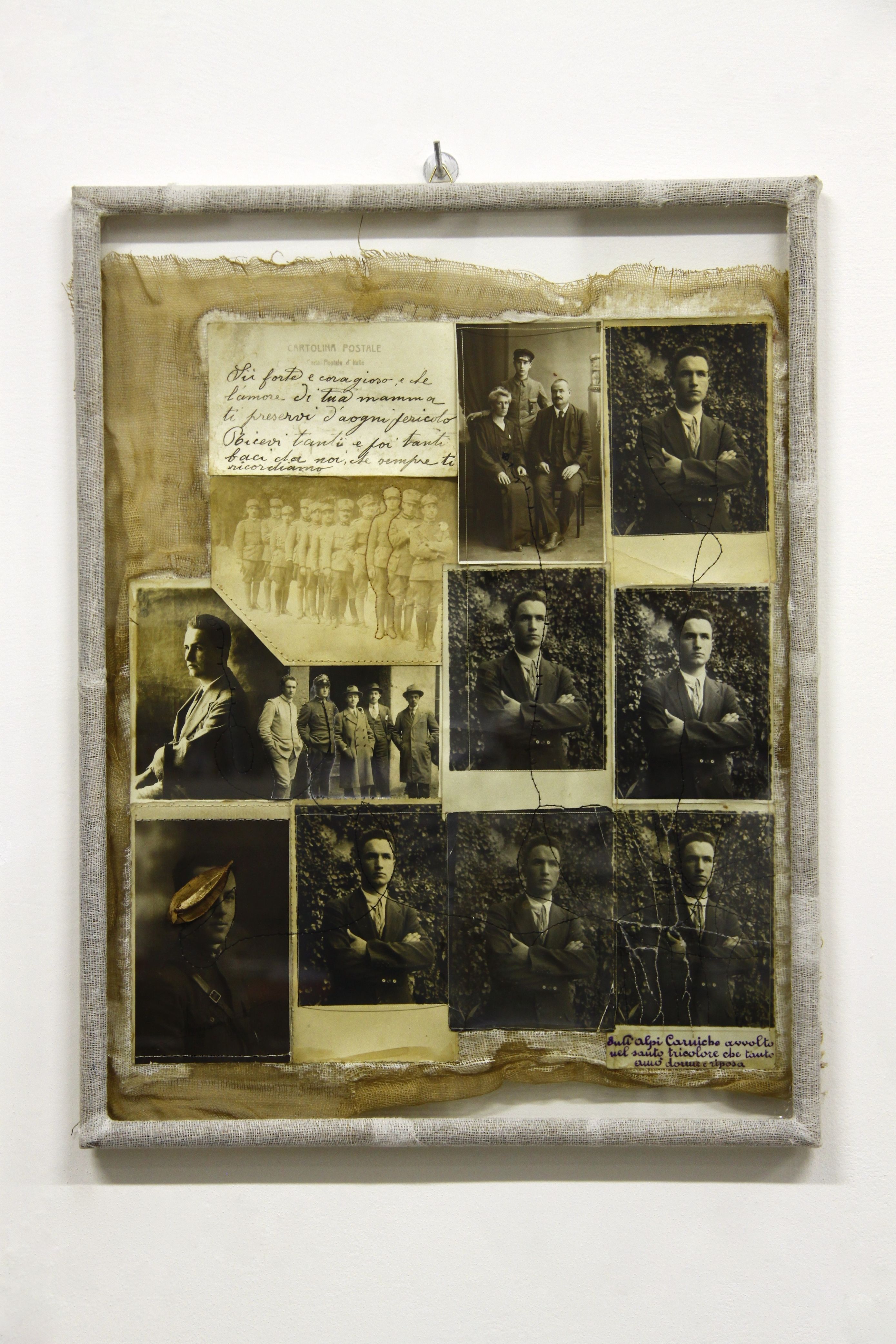 intervento con ago, filo e garza su fotografia d’epoca con cornice garzata, carta fotografica