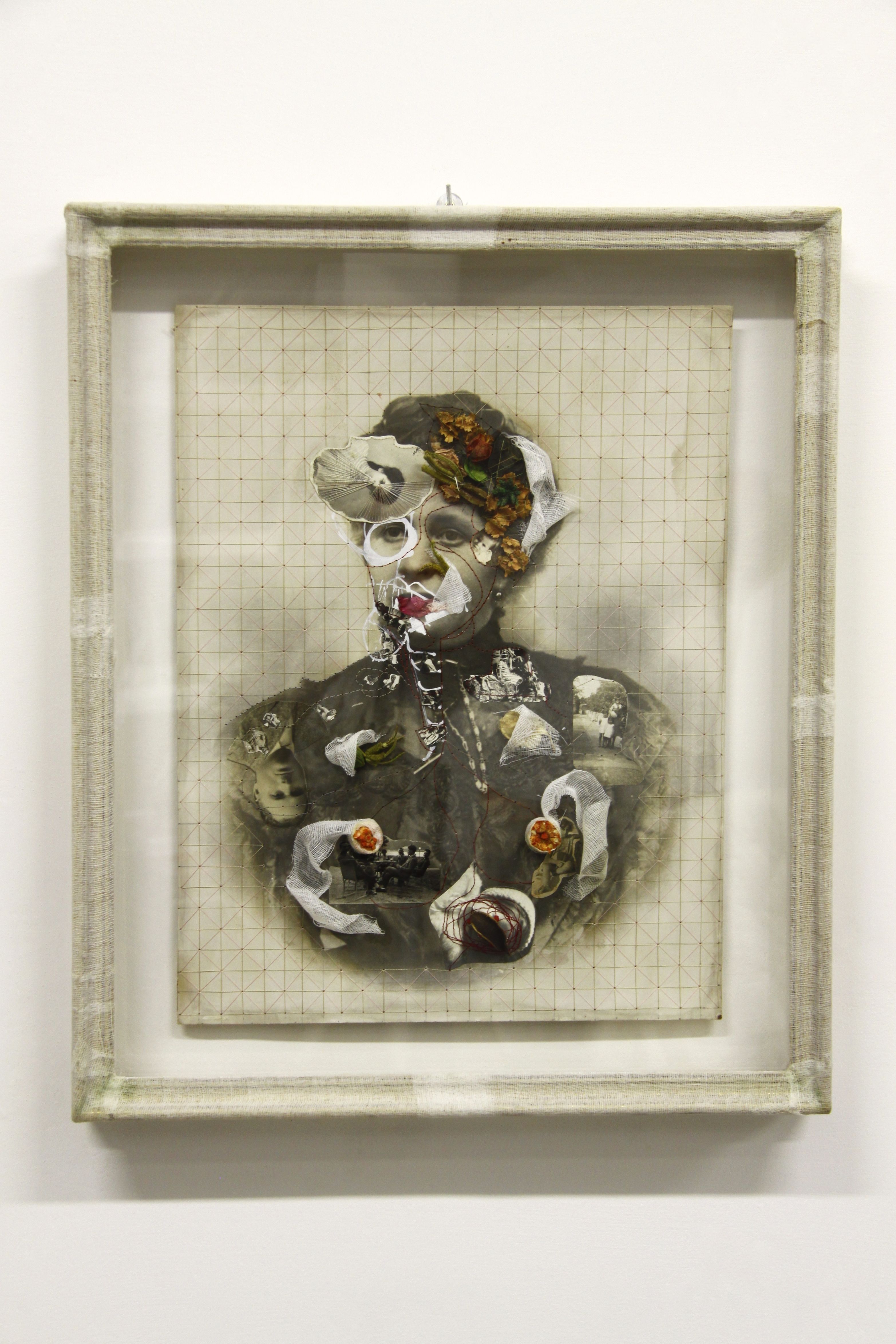 intervento con ago, filo e collages su fotografia d’epoca con cornice garzata, carta fotografica