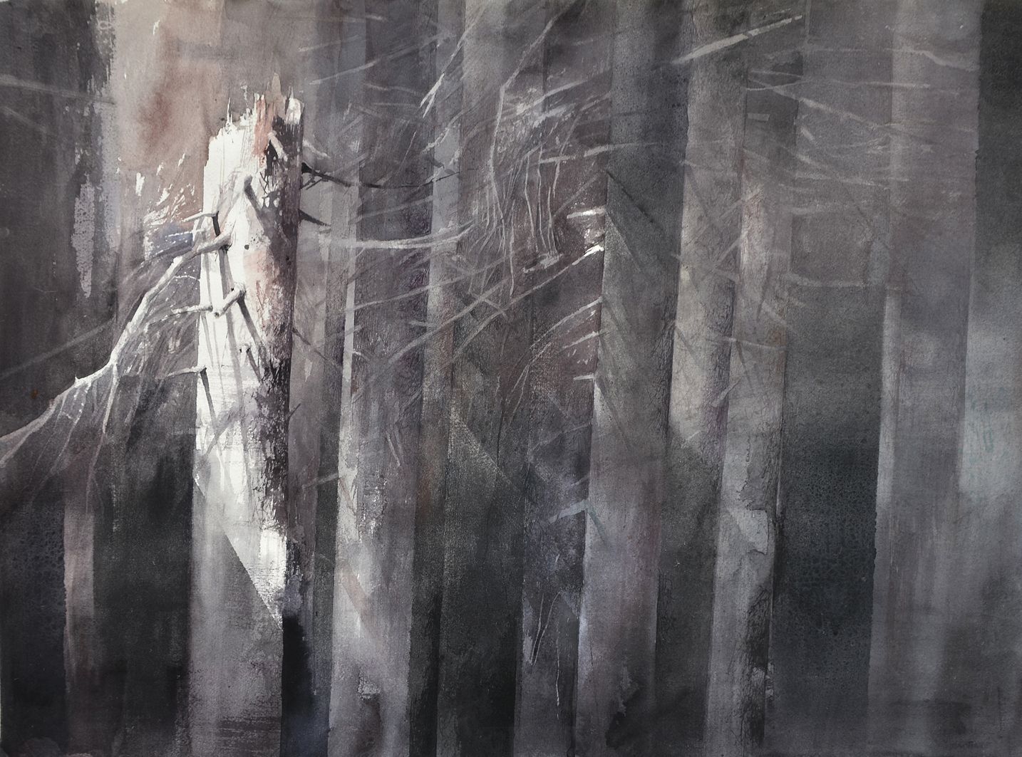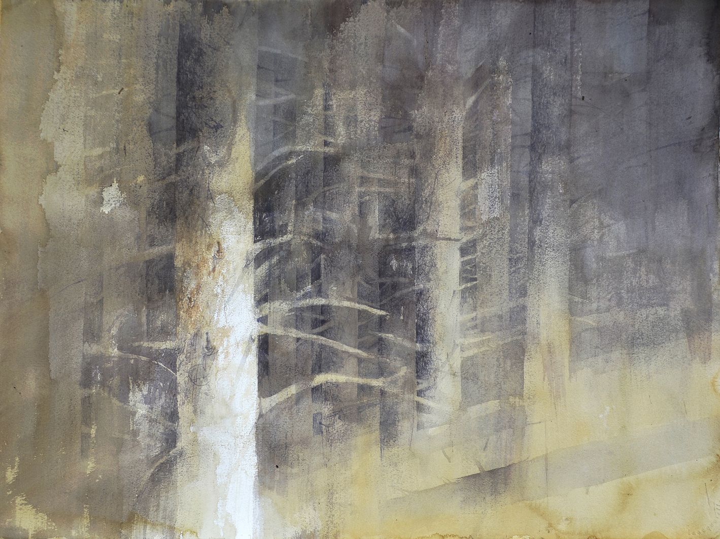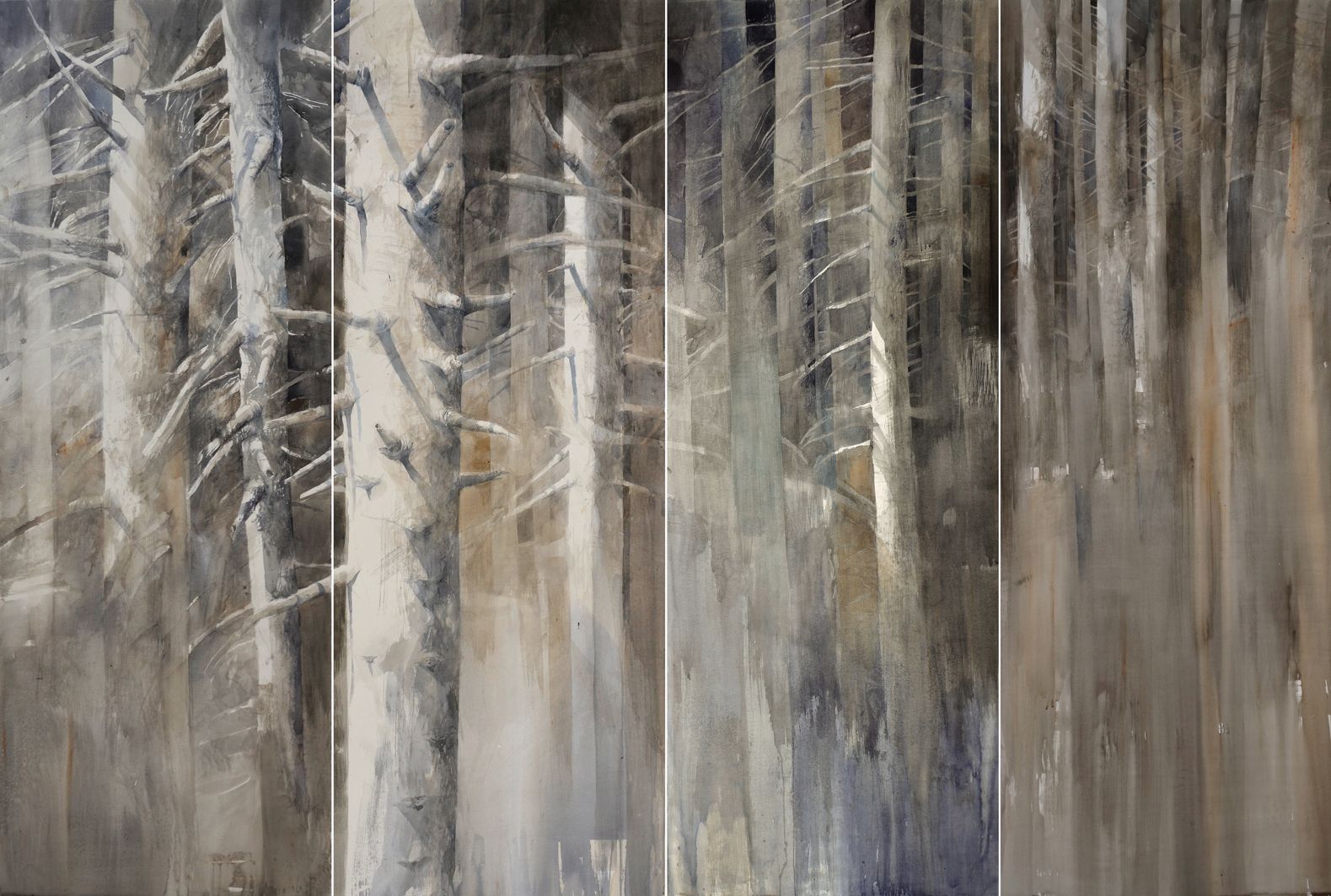 L’acquerello sottolinea la lingua della natura: si declina sotto la forza dell’acqua, ha una sintassi fluida, cede docile alla porosità del legno, si aggruma, scorre verso l’alto, snobbando la gravità, come la linfa. Un discorso sugli alberi fatto per moduli, sequenze, successioni, stagione dopo stagione, e poi di nuovo. Musicalmente daccapo.