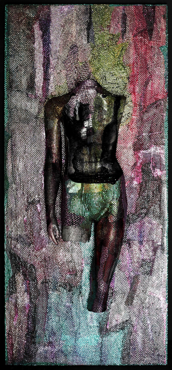 mista: manichino in vetroresina rivestito di tessuto lurex, legno