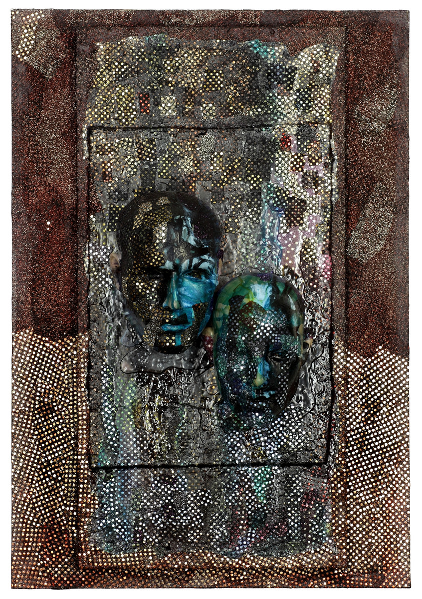 mista: volti di manichino in vetroresina rivestiti di tessuto lurex, legno