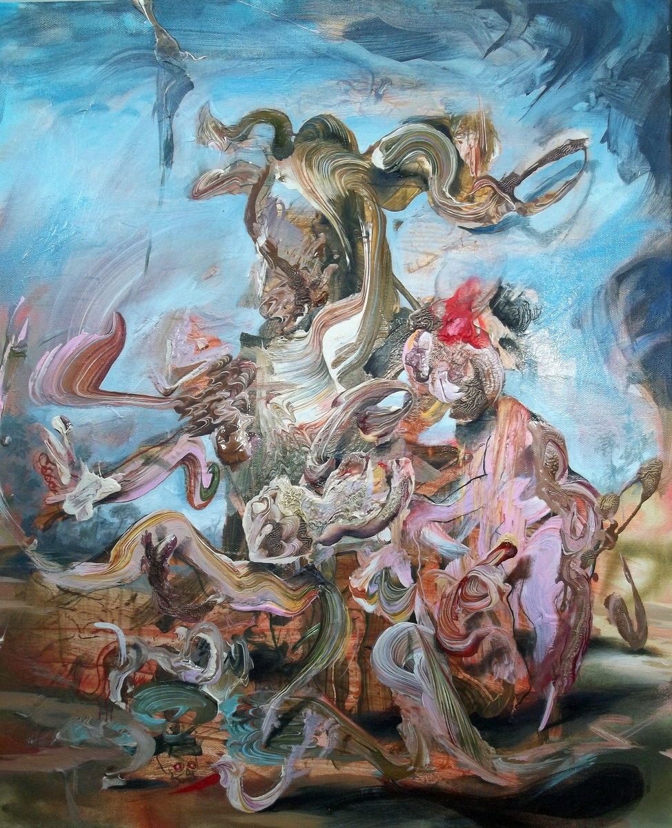 Paint is now poured and manipulated to create areas of thick and crusted surfaces, that are allowed to wrinkle and pock mark as the various mediums used dry out. Once this process has reached a certain point, the image is again finely adjusted to create areas of shadow and recession, to a point where a form may begin to emerge, but hopefully not too much. The pause button is then pressed, to hopefully allow something to sit forever on the cusp of becoming – neither an abstract blob of raw sienna nor the fold of flesh in a stomach, but both, and neither. This ability to be in two worlds at once, the past and the present, the abstract and the figurative, the imagined and the real, is what interest me and sustains me as an artist, and is the reason that I continue to make paintings.