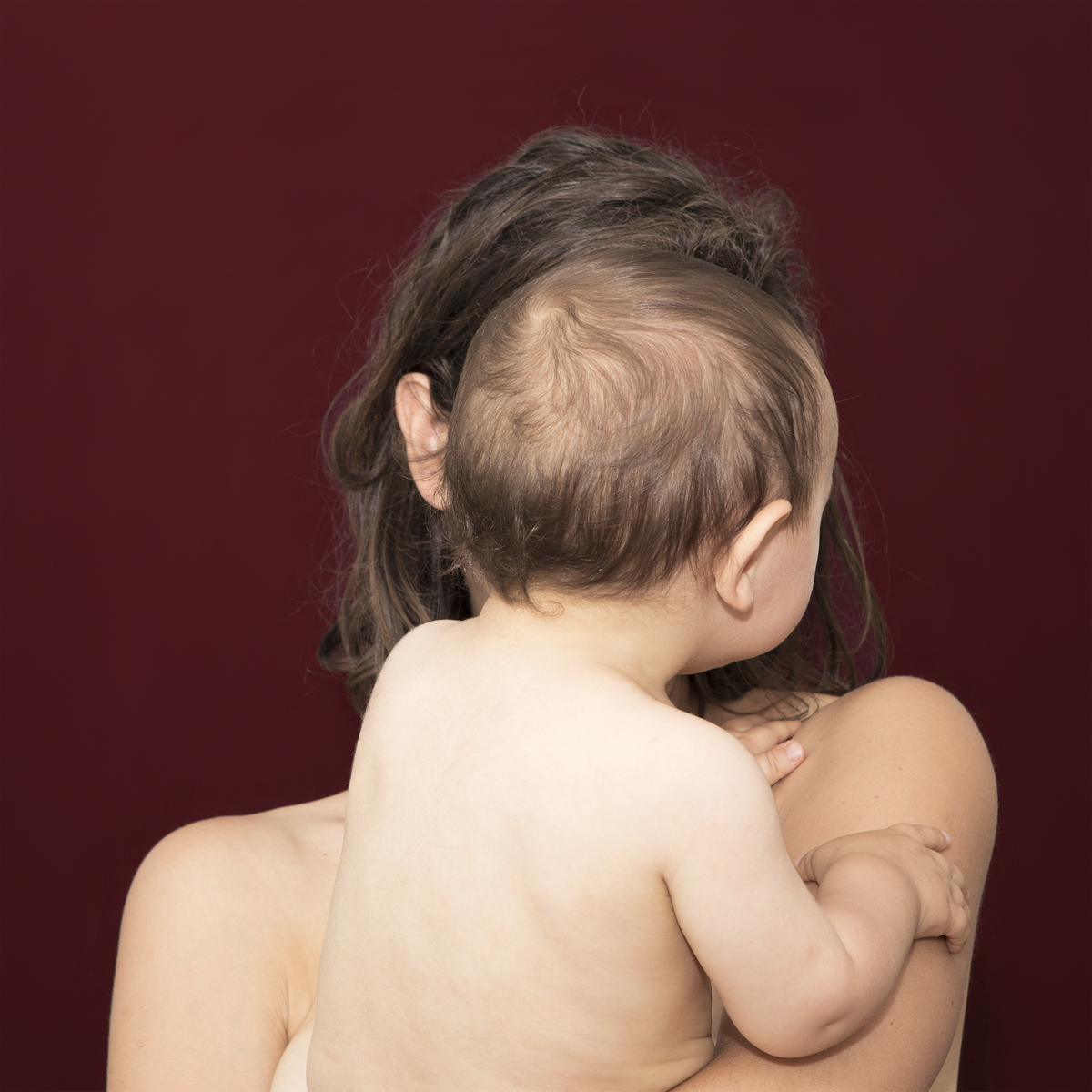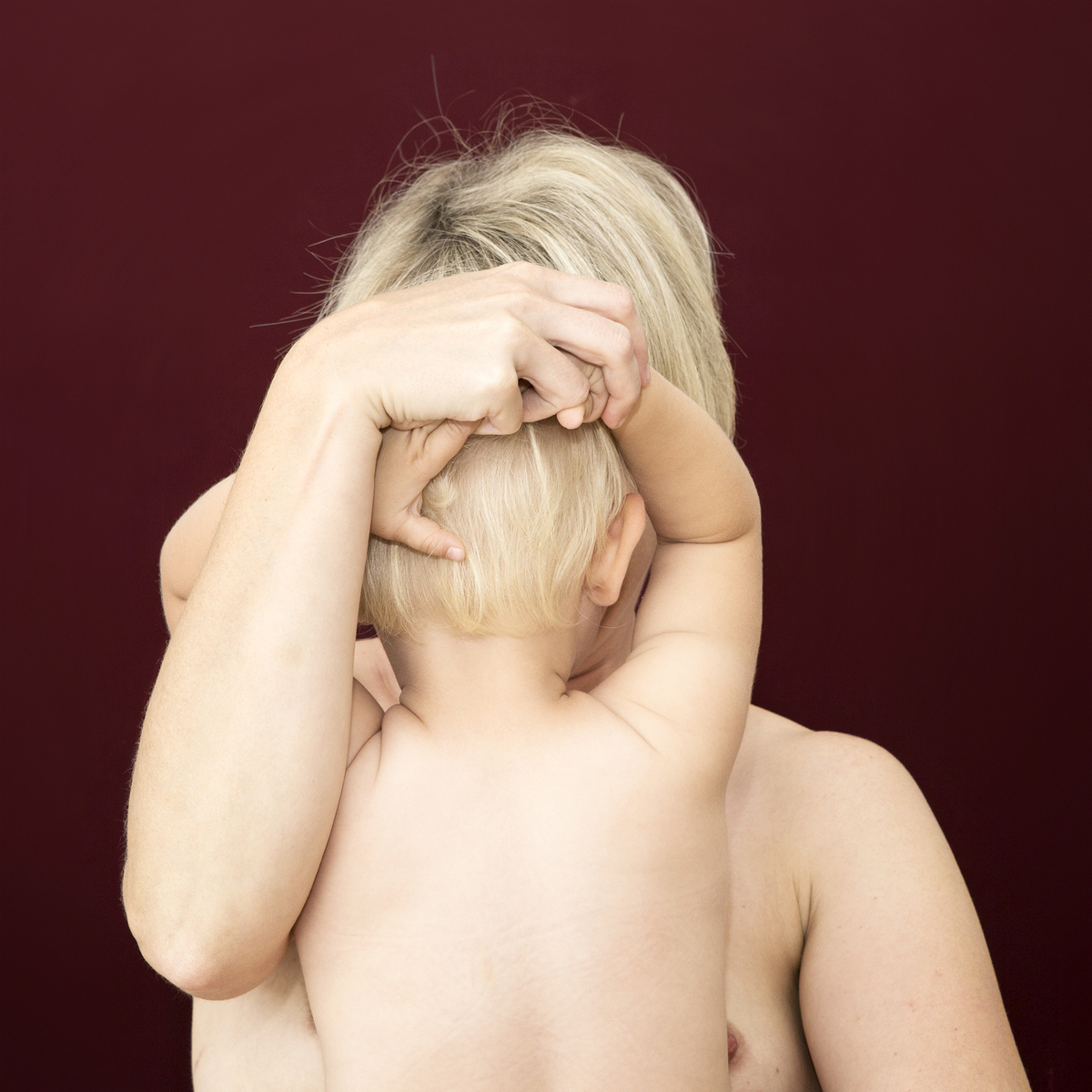 Mothers è una serie di ritratti di madri con i propri figli, che hanno un età compresa tra alcuni mesi e 3 anni, periodo in cui il loro rapporto può essere molto stretto, quasi simbiotico. C’è un riferimento alla pittura classica, sottolineato anche dallo sfondo rosso scuro, ma rispetto alle rappresentazioni della maternità nei dipinti rinascimentali e barocchi, queste immagini negano lo sguardo allo spettatore. I bambini sono rivolti verso la madre, coprendole il viso, e dandoci le spalle. La madre, perde momentaneamente la sua identità e i loro corpi sembrano fondersi in un essere quasi unico.