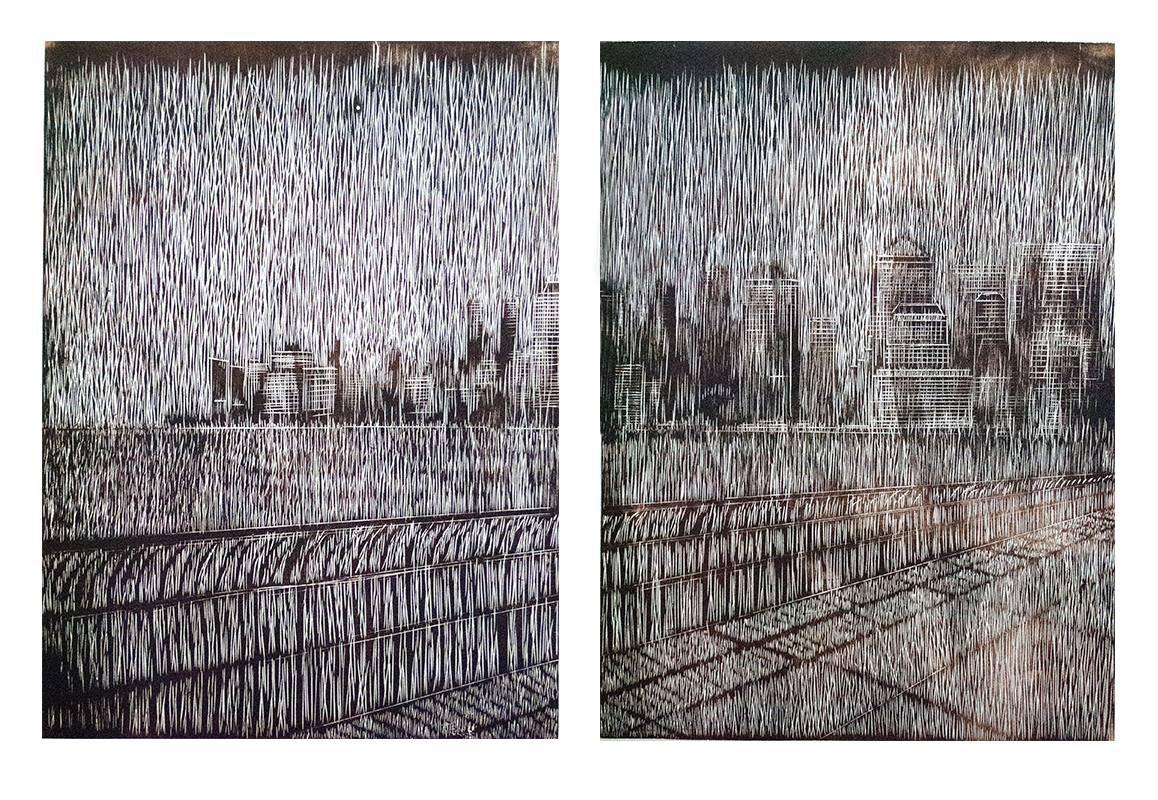 L’opera di Xilografia dal titolo ”Lampioni” è una realizzazione di grande formato, su tavola di legno di filo, rappresenta un contesto urbano contemporaneo attraverso le sue forme ed i suoi contenuti.