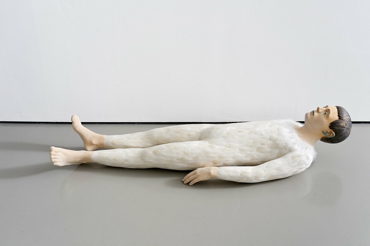 In questo lavoro ho voluto trasmettere nuovamente un senso di individualità, di distacco, dal punto di vista emotivo che formale e materiale. Il legno che va a comporre la figura si tramuta in piume, come a suggerire una leggerezza che si discosta dall’esperienza terrena.