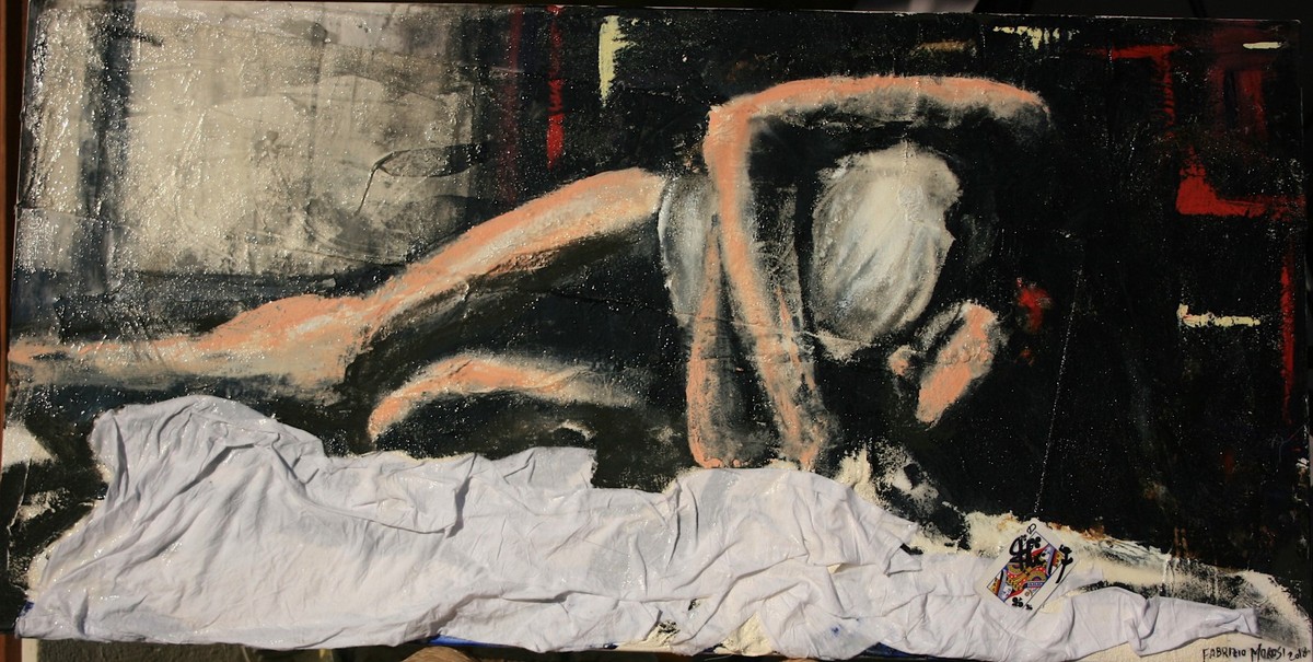 L’Opera eseguita con tecnica mista, con l’utilizzo di gesso e lenzuolo, raffigura una ragazza che abbraccia un guanciale stringendolo a se, questo gesto come sinonimo di bisogno da soddisfare, oppure un bel ricordo di un bisogno già soddisfatto...lascio all’osservatore la decisione!