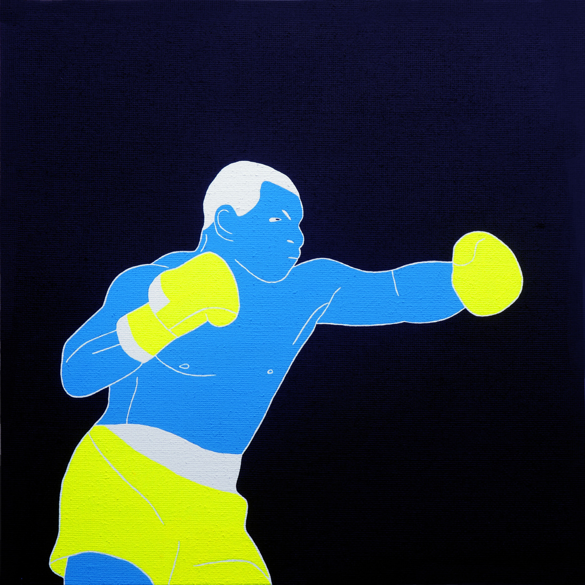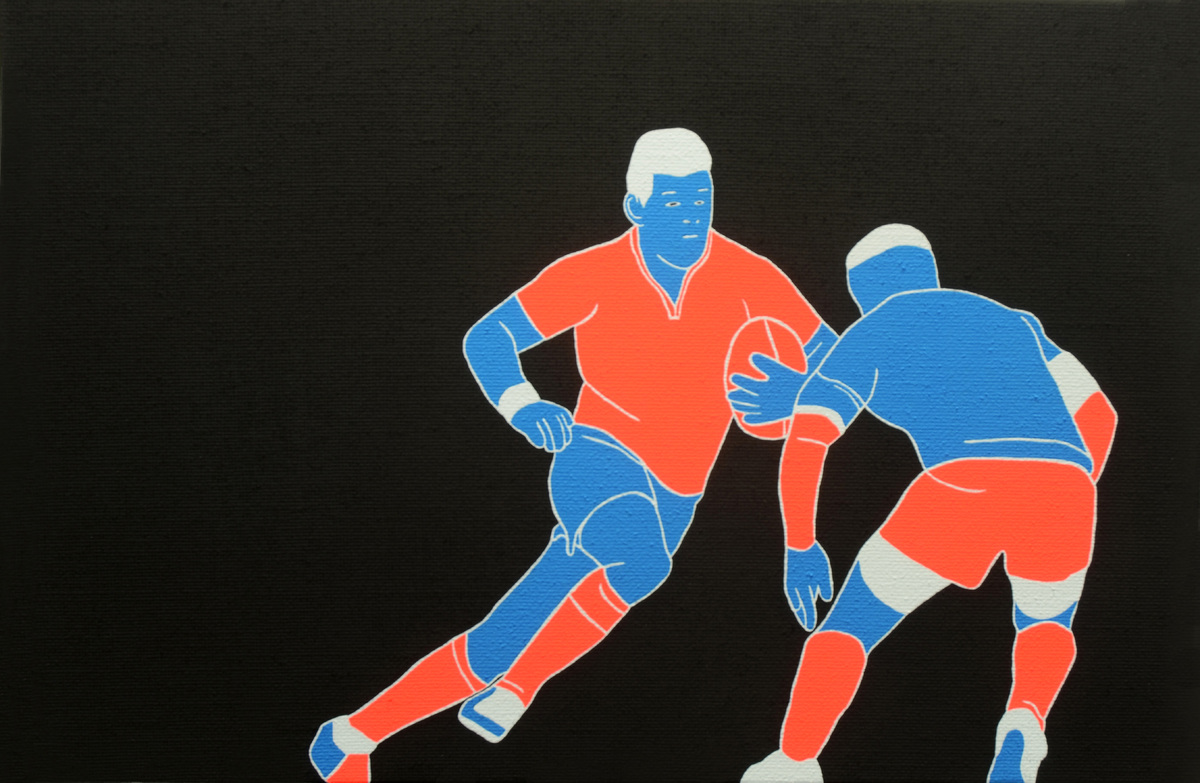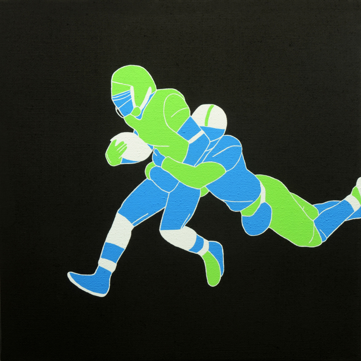 Confidence #1 è un dipinto misurante 50 x 50 cm, realizzato con acrilico su tela di juta, ed è parte di un’ampia ricerca artistica che l’artista Fosco Grisendi porta avanti dal 2012, che oggi comprende oltre ottanta opere analoghe in termini di materiali e tecnica utilizzati. Da un punto di vista tecnico, l’artista sceglie di utilizzare uno sfondo nero perché esalta le figure e la scelta di colori molto accesi. Lo sfondo in relazione alle figure dipinte è il contesto atemporale nel quale si trovano i soggetti rappresentati, attraverso cui Grisendi analizza i fatti meno coerenti del mondo attuale. In particolare, l’opera in esame fa parte di una serie di dipinti in cui la ricerca dell’artista si è focalizzata sull’intimo rapporto che esiste tra lo sport e l’arte, un rapporto agonistico tra l’artista e l’esistente. Infatti, entrambe le discipline sono legate alla natura profonda e primordiale dell’essere umano, a momenti di tensione come il placcaggio durante una partita di football americano.